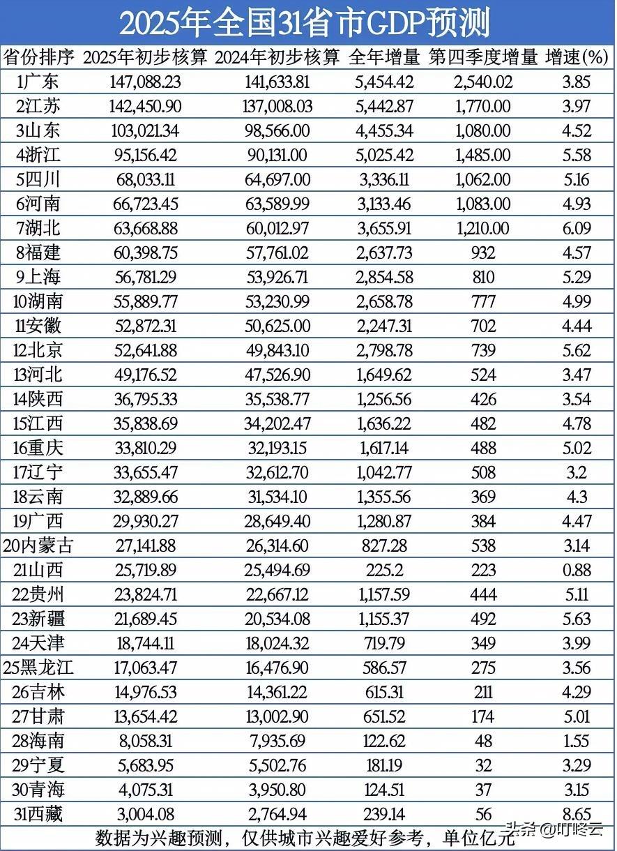 数据出炉!2025年全国各省市GDP预测数据排行榜揭秘!2025GDP前十名依然是:广东、江苏、山东、浙江、四川、河南、湖北、福建、上海、湖南。中部崛起正在变为现实,西部大开发也卓有成效,而东北振兴似乎越来越遥远!曾经的东北老工业基地,已经掉队很远了。原因是什么?欢迎评论区留言交流讨论相关话题![点亮平安灯][点亮平安灯][烟花][烟花] 欢迎关注@叮咚云 将优先为粉丝职业规划指导,1对1咨询是付费服务,为你定制最适合的就业择业方案!欢迎留言交流讨论。[来看我][来看我] 免责声明:图片来自网络,仅供参考! 央国企求职条件 央国企求职 央国企招聘 央国企求职就业