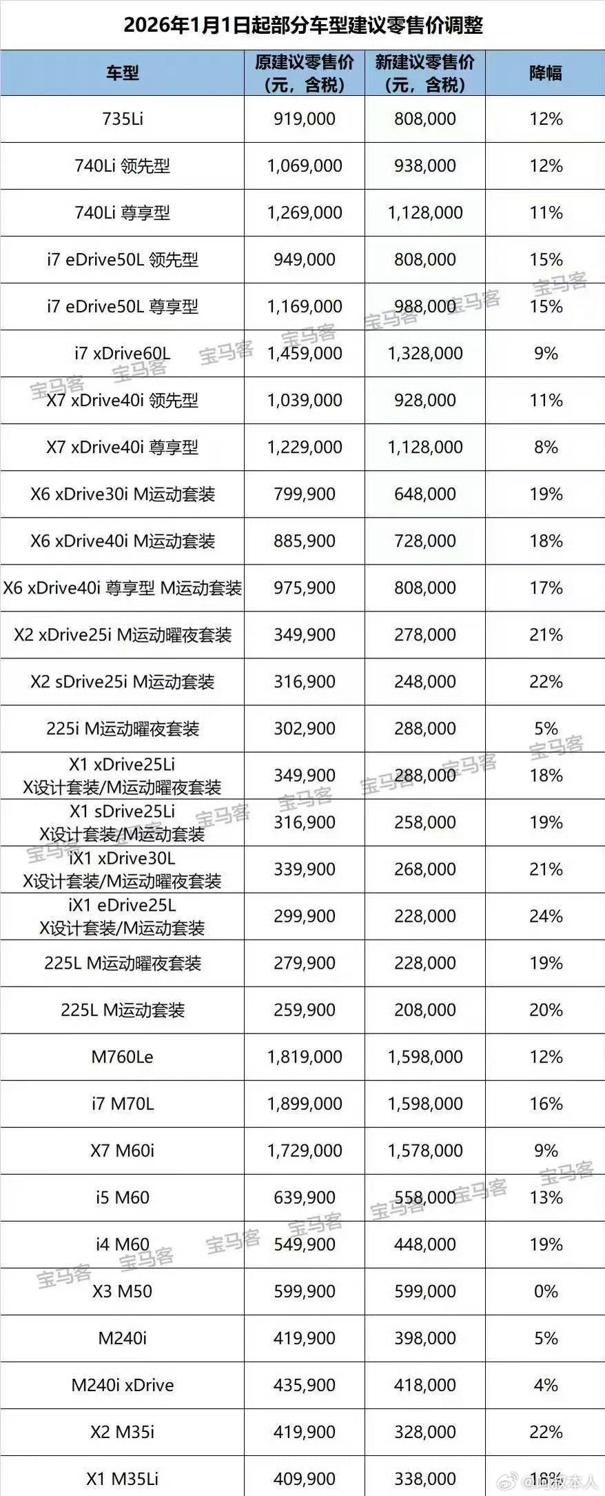 宝马开年引爆价格战宝马大降价开卷!刚到2026年宝马中国就对旗下31款主力车型集体调价,覆盖燃油、新能源、高性能全赛道,最高降幅超过了30万,堪称豪华品牌最大规模单次调价。这其实就是一次打破豪华车入门底线的价格战,倒逼豪华车市格局重构,奥迪是大概率会跟进,更不用说沃尔沃和凯迪拉克等一众二线豪华品牌了。据说纯电旗舰i7 M70L降30.1万(降16%);新能源入门iX1 eDrive25L降7.19万(降24%);燃油版X1 sDrive25Li降5.89万(降19%),燃油版X1xDrive25Li降5.19万(降18%);7系轿车735Li降11.1万(降12%),7系轿车740Li领先型降13.1万(降12%),7系轿车740Li尊享型降14.1万(降11%);2系四门轿跑车降11.11万(降34%),M235L降6.59万(降18%),更多看下图表格里……宝马大范围调价宝马中国降价