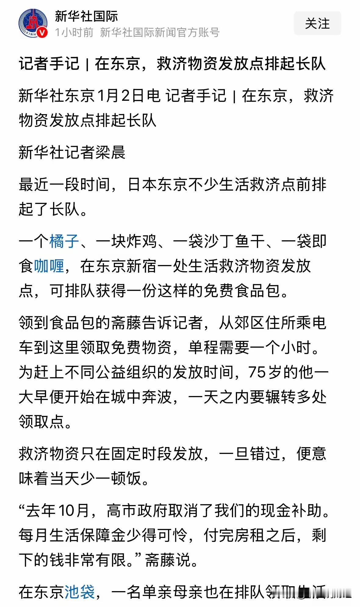 新年新消息,新年好消息,新华社发布重磅好消息,日本东京很多人在排队领救济。一个橘子、一块炸鸡、一袋沙丁鱼干、一袋即食咖喱,“一旦错过,便意味着当天少一顿饭”! 以前有人说她们经济发达,东京是世界上最富裕的城市,排队领救济的事实证明,他们已经不行了,衰退了,衰退的非常快,很多人需要救济才能生活。 即使没有去哪里,也可以想象得到,他们很多人确实是需要领救济,那个很有名气的佳能公司,在中山都经营不下去了,得有多少人失业啊?日本群众 经济救济 日本创业补助金 东京补助金 东京补助 日本领失业金 日本救助 日本失业金 日本企业补助金 日本生活福利 东京退税