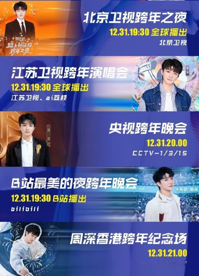 周深参加了四台跨年晚会! 周深是跨年夜最忙的歌手了,分别参加了央视、江苏卫视、北京卫视、B站四个跨年晚会,演唱了八首歌,但事实上,他真人当晚在香港开演唱会,所以不用怀疑,就是录播,有好几位歌手都是录播。