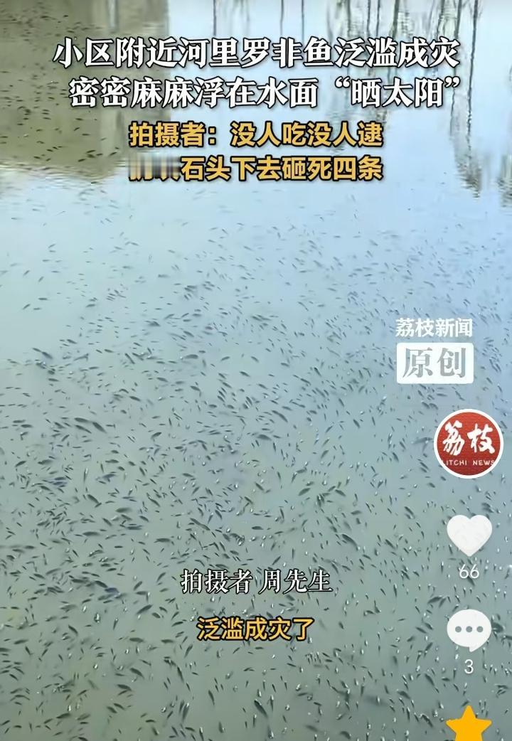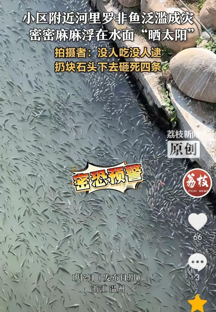 泛滥成灾了!浙江温州,一小区附近河里罗非鱼泛滥成灾,因为天气比较冷,罗非鱼都浮出水面晒太阳,水面上密密麻麻全是罗非鱼,拍摄者称,我们这边的人不吃罗非鱼,我儿子拿了一块大石头砸下去,砸死了四条。 罗非鱼性成熟早,繁殖周期短,所以繁殖的速度就特别快,如果人们在不去捕捞,不去吃,那么泛滥成灾也就是迟早的事。 罗非鱼作为外来入侵物种,会严重破坏本地水域的生态平衡,所以有必要采取一些措施。 比如,采取人工捕捞,生物控制,技术灭杀和资源化利用等综合措施来抑制罗非鱼数量的增加。