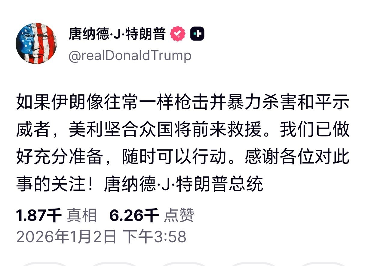 特朗普发文威胁伊朗特朗普发文:如果伊朗像往常一样枪击并暴力杀害和平示威者,美国将前来救援。