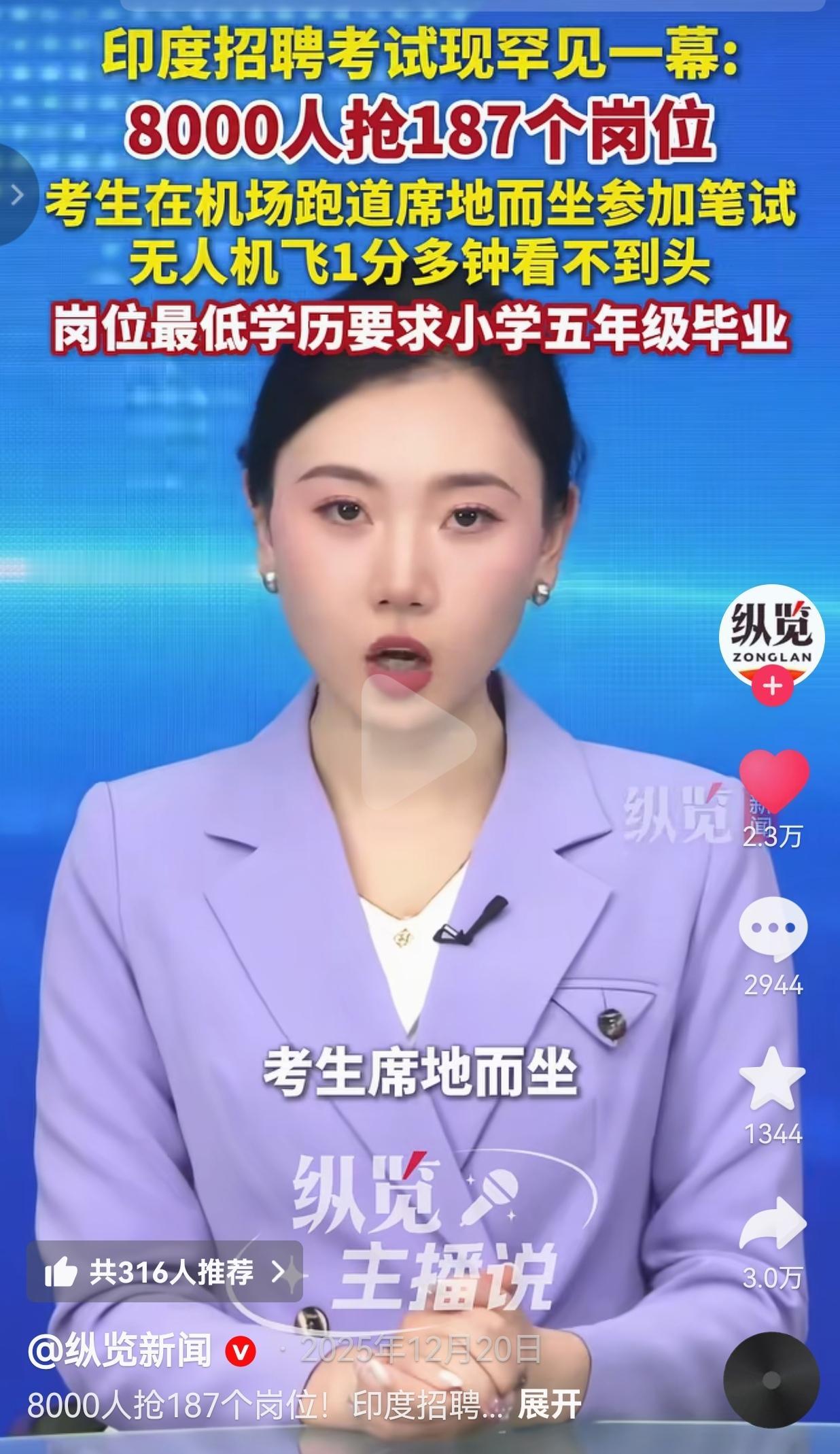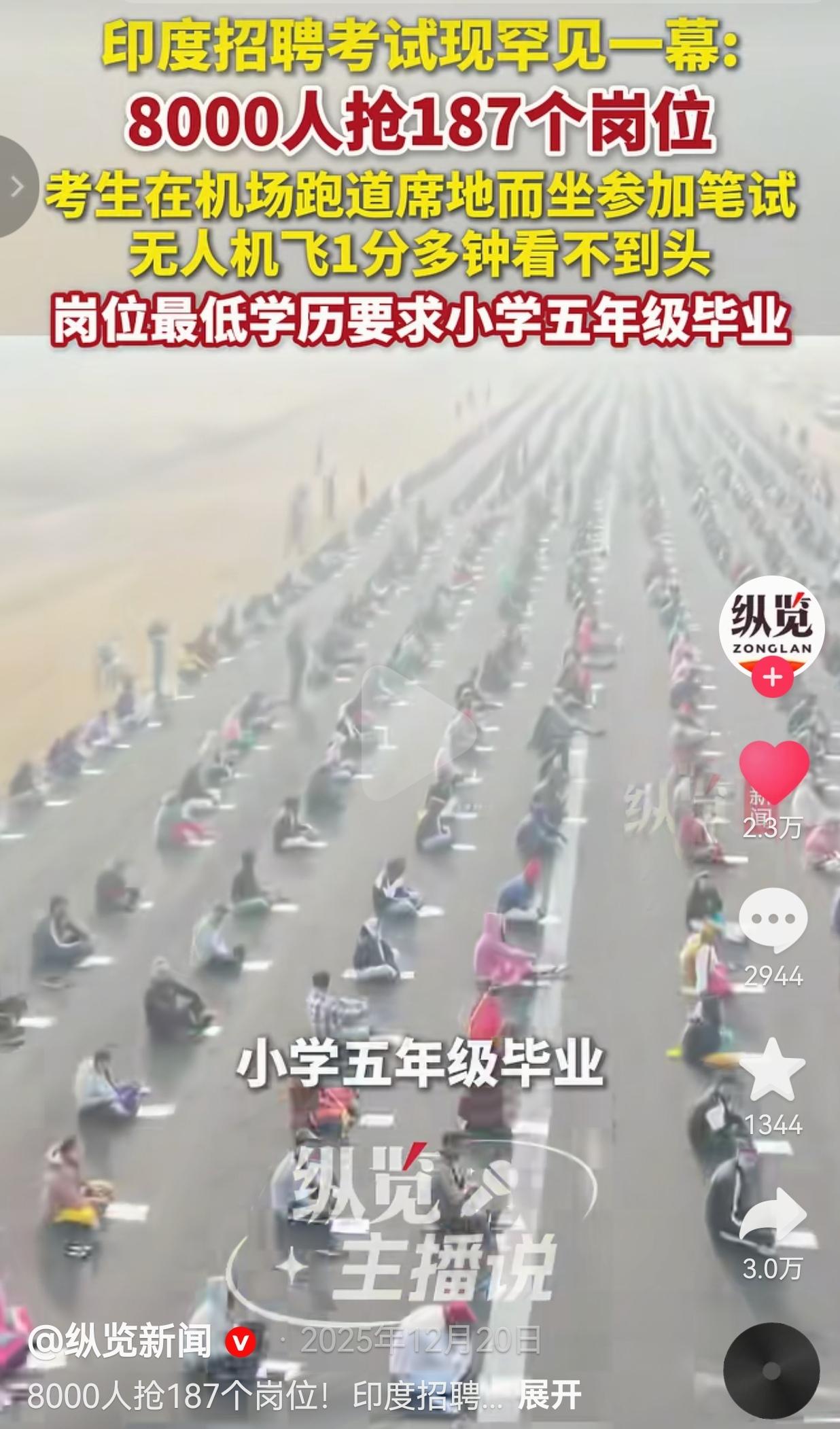 这种考试也不容易啊!印度招聘考试出现罕见一幕,8000人抢187个岗位,考生在机场跑道席地而坐参加笔试,无人机1分多钟看不到头。网友:原来不是只有我们这边考编卷,全世界的打工人都在求稳! 近日,在印度奥迪沙邦的机场跑道上,一大群人席地而坐,无人机飞出去一分多钟,镜头里还是望不到头的人潮。 这是干什么呢?原来这就是一场国民警卫队的招聘考试。本来这场考试,分到20所学校考试,结果警方索性把考场挪到了开阔的机场跑道,说这样既避免混乱,也能保障安全。 就这么着,8000个考生挤在露天跑道上,争那187个岗位。 你敢信吗?这些岗位最低只要小学五年级学历就能报,可是,来参加考试的,一多半都是本科生、硕士生。 考生们就坐在冰凉的跑道上,在露天里答了90分钟的卷子。现场人虽多,却站着不少工作人员,天上还有无人机来回监考。 可看着他们一个个埋着头写字的样子,谁能不叹口气?真没法想象,一群念了十几年书的高学历人,会为了个“小学学历就能报”的岗位拼破头。 这场在机场里的考试,活脱脱就是一面镜子。照出了就业市场的冷,也照出了普通人心里那点对“安全感”的盼头。 我们总说“读书无用”是瞎话,可当高学历的人抢着考低门槛岗位时,也该琢磨琢磨,怎么才能让每个好好读书的人,都能找到配得上自己的出路。让每个人对生活的那点期待,都能被现实好好接住。 其实看着这一幕,也该想明白:生活哪有什么非黑即白的选择,为了生活低头不丢人,为了目标咬牙坚持的人,更值得敬。 不管前路多难,好好过日子、使劲往前走的人,都应该值得所有人学习。