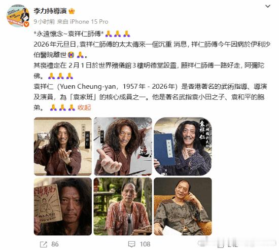 香港著名演员袁祥仁去世:《功夫》里向周星驰推销如来神掌香港导演李力持在个人微博上透露,香港著名演员、武术指导袁祥仁1月1日因病于伊利沙伯医院去世,享年69岁。据悉,丧礼定在2月1日于世界殡仪馆3楼明德堂设灵。据介绍,袁祥仁于1957年出生于中国香港,是武术指导袁小田之子,自幼习武。1960年代末,以助理武术指导身份入行,参与电影《报仇》《游侠儿》等武术设计。1976年,参演电影《流星蝴蝶剑》。1970年代末至1980年代初,和其胞兄袁和平创办了“和平电影公司”并组成“袁家班”。1991年,担任电影《黄飞鸿》武术指导,并获得第11届香港电影金像奖最佳动作指导奖。1992年,《武状元苏乞儿》中饰演“睡梦罗汉拳”的老乞丐。1993年,《太极张三丰》中饰演凌道士。1994年,《精武英雄》中饰演探长。1996年,《大内密探零零发》反串饰演无相王之妻。2004年,《功夫》中饰演售卖《如来神掌》的乞丐。2010年,《越光宝盒》中第三次饰演乞丐。2013年,参演电影《一代宗师》。2018年,凭借电影《奇门遁甲》获第37届香港电影金像奖最佳动作指导提名。2024年,参演《天行健》。2025年,参演《红嫁衣》《风味快餐车》。2026年1月1日,因病于香港去世。