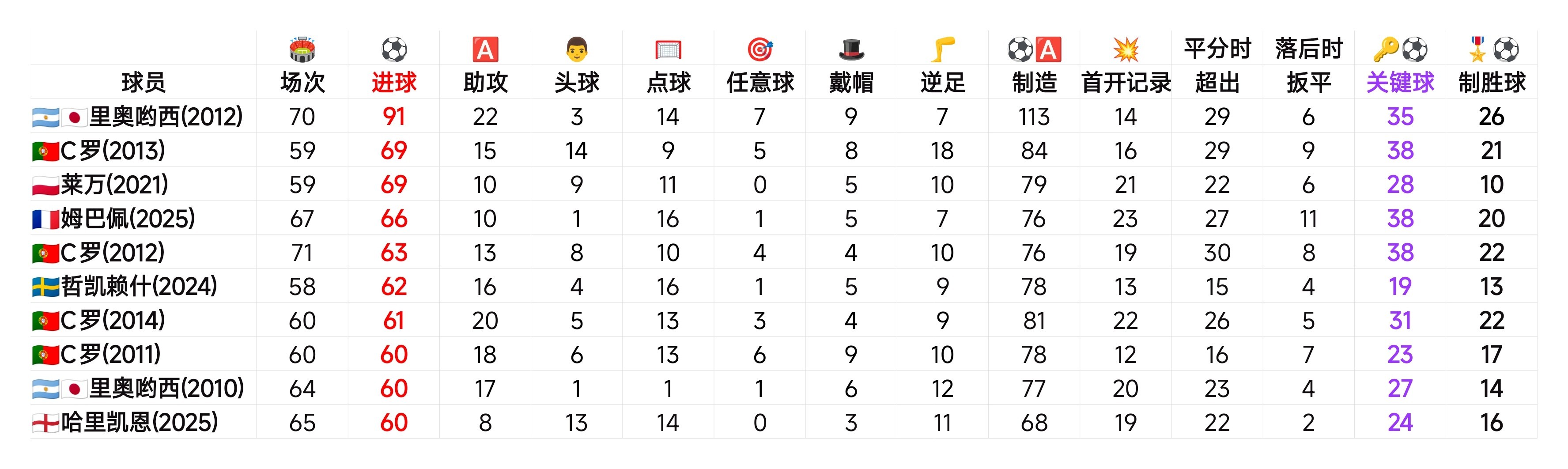 C罗和c罗一起siu到最后姆巴佩2025年66球 🚨21世纪年度打进60+进球的球员数据统计👇2013年的C罗最全面,头球、任意球、逆足都没有任何短板,关键球也是最多的。
