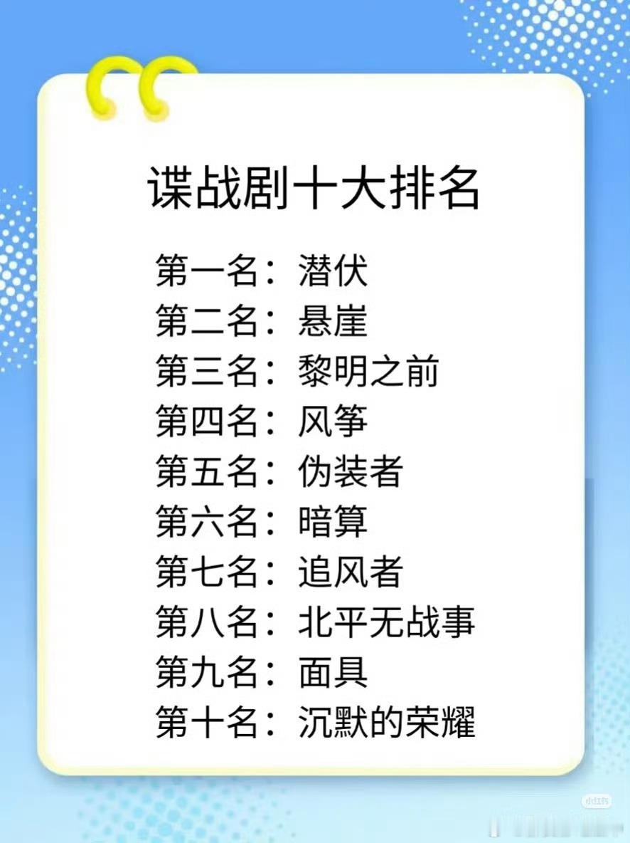 谍战剧十大排名,倒是都听过大名,有几部没看过