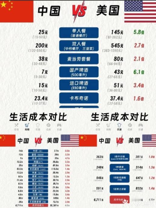 美媒公布中美个人开支消费对比,结果一出,媒体安静了...... 美国:电费每月人均110美元 ,是中国的11倍 ,水费也是11倍 ,燃气费2.44倍。 美国物业费每月100至300美元,中国100平的房子每月200至500元人民币,美国是中国的5倍...... 美媒公布的中美个人开支消费对比一出来,不少人都看清了所谓“高收入”背后的真实消费压力,这大概就是媒体突然安静的原因。先看最基础的水电燃气,美国人均每月电费110美元,是中国的11倍,这背后其实是用电习惯和总量的差距。 美国人的住宅用电总量远远超过中国居民,夏天全屋空调从早开到晚,冬天取暖也全靠电,家里的冰箱、烘干机这些电器几乎不关机,连数据中心的用电需求都在逐年飙升,分摊到每个人头上,电费自然居高不下。 更关键的是美国电价涨幅还在持续领跑通胀,过去十年累计涨了三成多,像加州这样的地方甚至翻了近一倍。 中国这边则不同,居民电价长期稳定在0.5到0.8元每千瓦时,加上政府对民生用电的精准调控,就算夏天开空调,普通家庭每月电费也就几十块,分摊到人均更是少得可怜。大家用电时会下意识省一点,电器也更看重节能效果,这种习惯进一步拉低了实际开支。 接着看水费,美国人均每月水费同样是中国的11倍,折算下来每个月要花近26美元。这不是说美国人用水有多浪费,而是其供水系统的维护成本、管网建设费用都摊在了用户身上,加上部分地区水资源紧张,水价自然居高不下。 中国则通过阶梯水价制度引导合理用水,同时政府承担了大量基础设施建设成本,大多数城市居民人均月水费也就十几块,就算夏天用水多,也不会有太大压力。 燃气费的差距虽然没那么夸张,但也很明显,美国是中国的2.44倍。美国普通家庭每月燃气开支大概14.6美元,主要用来供暖和做饭,而中国居民人均每月燃气费也就6块多人民币。 这背后既有燃气开采和运输成本的差异,也和中国的能源价格调控政策有关,政府会通过联动机制平抑燃气价格波动,确保民生开支稳定。 除了水电燃气,物业费更是能看出差距。美国普通住宅每月物业费在100到300美元之间,就算是中等配置的小区,每月也得掏200美元左右。 中国100平的房子,物业费大多在200到500元人民币,算下来美国物业费至少是中国的5倍。 别觉得美国物业费贵有道理,很多小区也就是基础的安保和绿化,反而中国小区的物业服务更细致,快递代收、公共区域保洁都做得很到位。 有意思的是把这些开支加起来,美国居民每月在基础生活开支上就要花掉近350美元,折合人民币2500多块。中国居民同等项目的开支也就200多块,就算加上其他零碎花费,每月基础开支也超不过500块。 更扎心的是美国所谓的高收入,扣掉这些刚性开支后,剩下的钱还要应对高额的医疗和教育费用,普通人的储蓄率其实很低。 中国居民2024年人均可支配收入已经超过4万元,虽然绝对值不如美国,但基础生活开支占比极低,剩下的钱可以用来旅游、消费或者储蓄。 就拿吃饭来说,中国普通人每天花20块就能吃得很丰盛,早餐的豆浆油条也就几块钱,而美国一顿普通快餐就要十几美元,长期下来又是一笔不小的开支。 美媒原本可能想通过对比凸显美国的“高收入优势”,没料到算完细账后,反而暴露了其民生开支的沉重压力。之前总有人吹美国生活多惬意,看完这份消费对比才明白,所谓的高收入根本经不住细算。 那些天天喊着“美国梦”的媒体,面对这样的真实数据,自然没话可说只能保持安静。毕竟一旦戳破了“高收入低压力”的谎言,很多固有认知都会崩塌,这大概就是他们集体沉默的真正原因。 其实这种差距本质上是发展模式的不同,中国始终把民生保障放在首位,通过完善价格治理机制稳定基础能源价格,让普通人能享受到实惠。 美国则更侧重市场自由定价,加上基础设施老化、维护成本高企,最终这些成本都转嫁到了普通民众身上。 不是说谁的模式绝对更好,但从基础生活开支来看,中国居民的实际生活压力确实小了很多,这一点数据不会说谎。