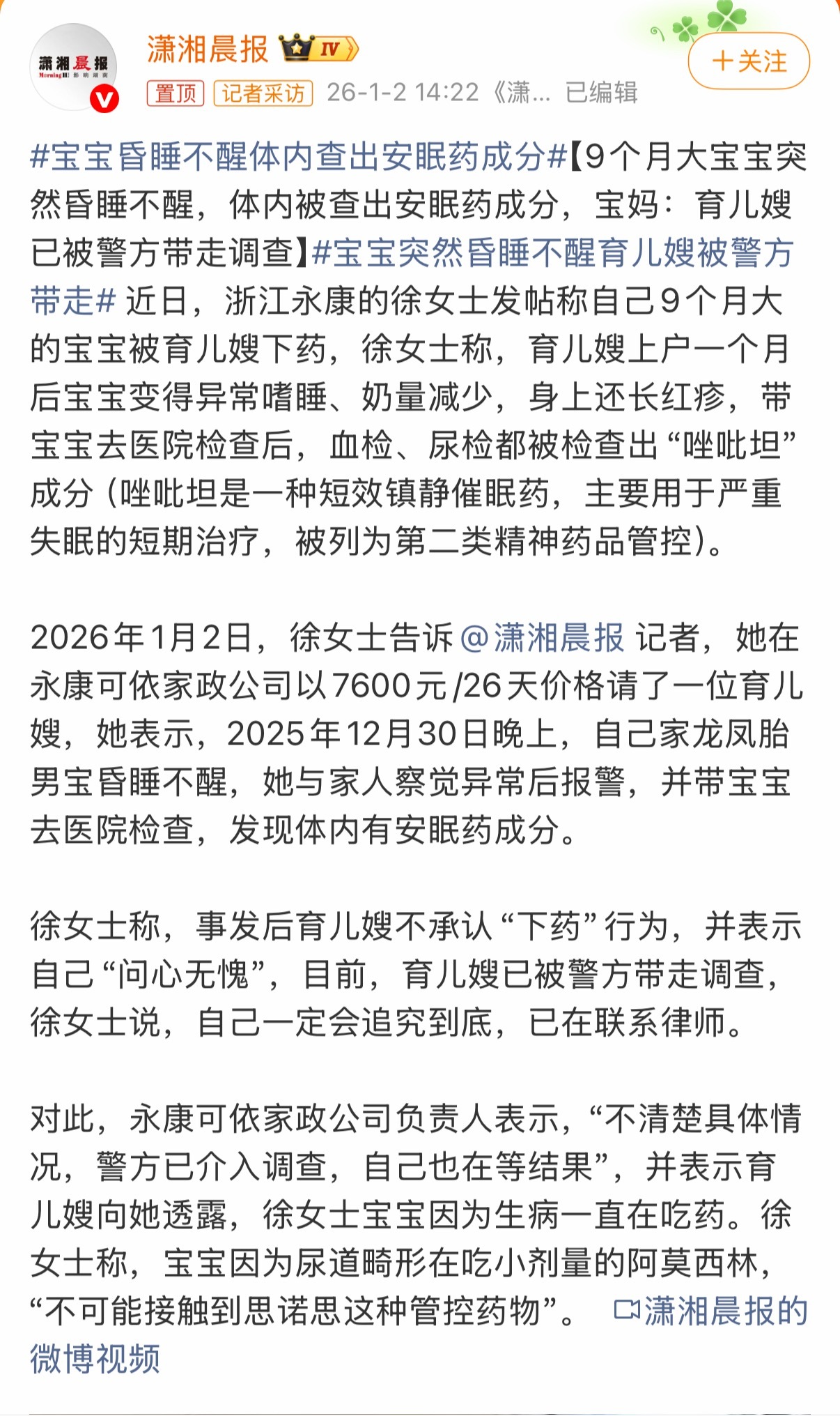 咱妈能不能管家政行业尤其是育儿类家政!?多少起了?现在鼓励生娃花了那么多财政预算,我真的很建议从每年3600的育儿津贴里扒拉出来一部分甚至全部,来建立育儿家政行业的监管、培养、考评、惩罚体系,双职工家庭要顾全一家的开支和长久的职业发展,现在真的没办法像过去一样散养或者牺牲职业生涯全职带娃,可以说育儿家政体系或者公共托育体系就是双职工家庭是否放心生娃的重要指标之一,可是看看现在这些数量并不罕见的魔鬼,拿着高薪干着不是人的事儿,几乎没有犯罪成本,这对吗?!真的要逼着一些极端情况下出现一两个极端父母干出极端事情才能被看到和重视吗?!宝宝昏睡不醒体内查出安眠药成分