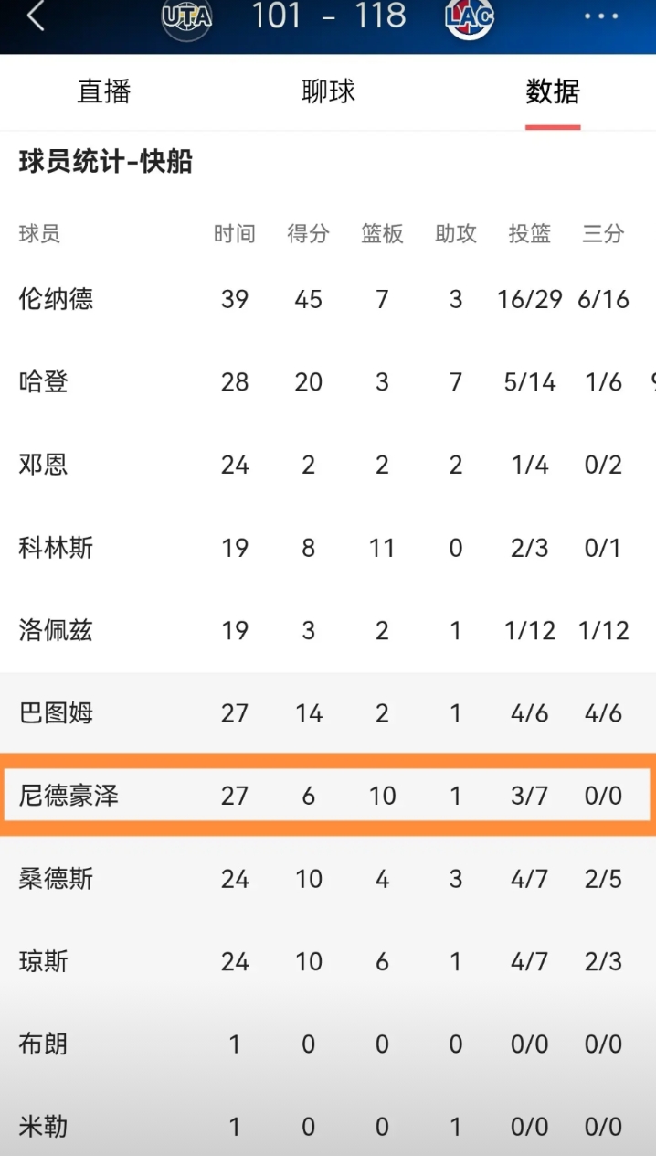 值得一提的是,本场比赛尼德豪泽拼抢到了6个前场篮板,展现出了超强积极性。在我看来,尼德豪泽一定能够在未来成为快船的内线支柱。