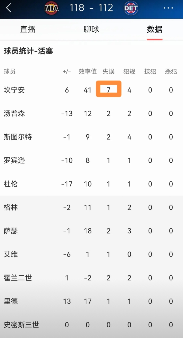 活塞当家球星康宁汉姆必须背锅了!今天活塞在主场以112:118不敌热火,此役康宁汉姆在失误端大发神威疯狂的出现了7次失误,是球队输球的罪魁祸首。