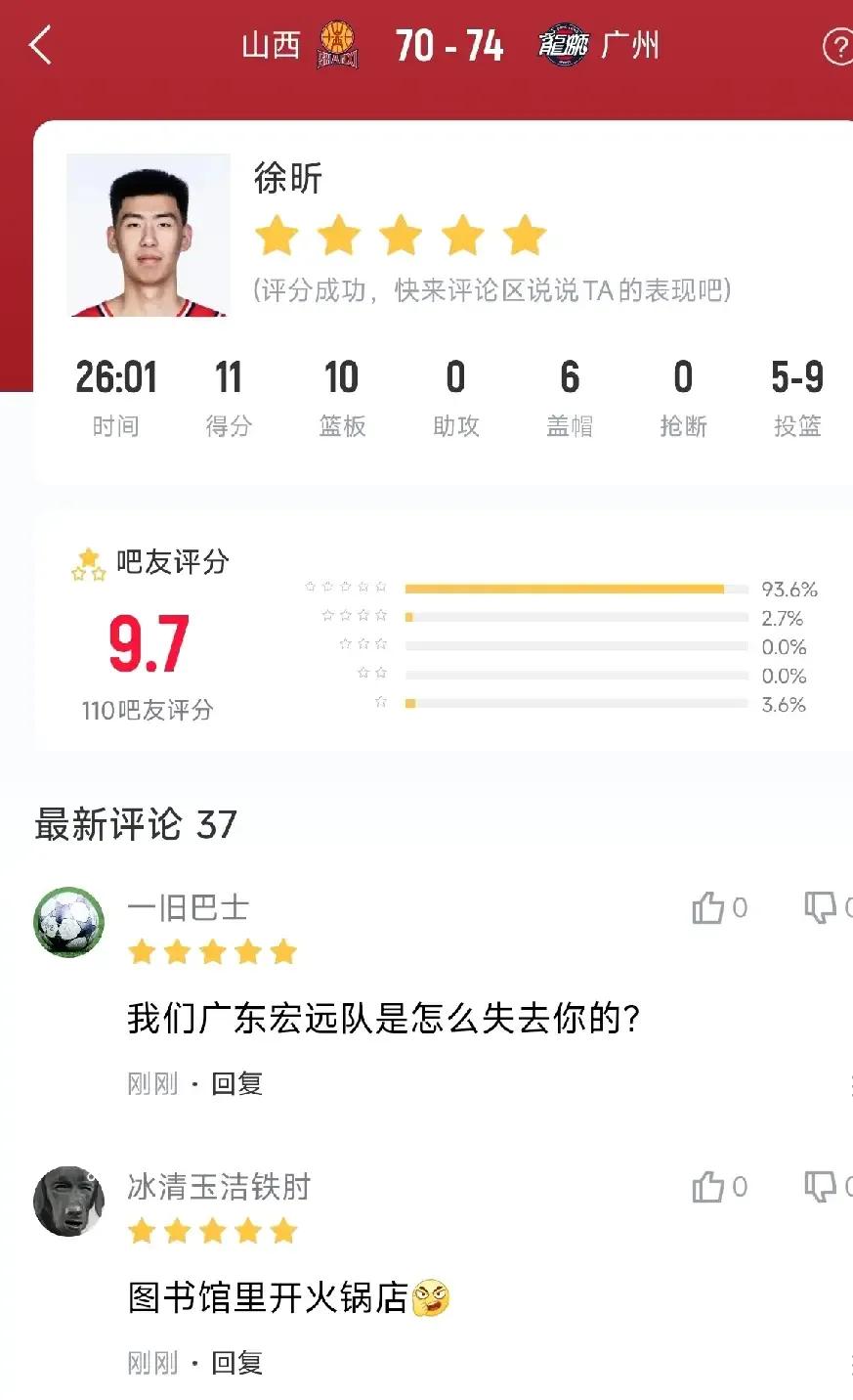 没毛病!徐昕只是回礼给山西,徐昕在广州队打得很有自信,也够强硬!能够在山西的比赛中拿到11分10个篮板6个盖帽的数据,比起广东队的王少杰,焦泊乔超出几条街[点赞]事实证明徐昕不是外界所说的大番薯!在广州场均10+以上,是一个首发最稳定的第一中锋!所以今年徐昕选择离开广东,是明智之举[点赞]徐昕继续加油!用成绩让看不起你的人打脸,闭嘴![666]