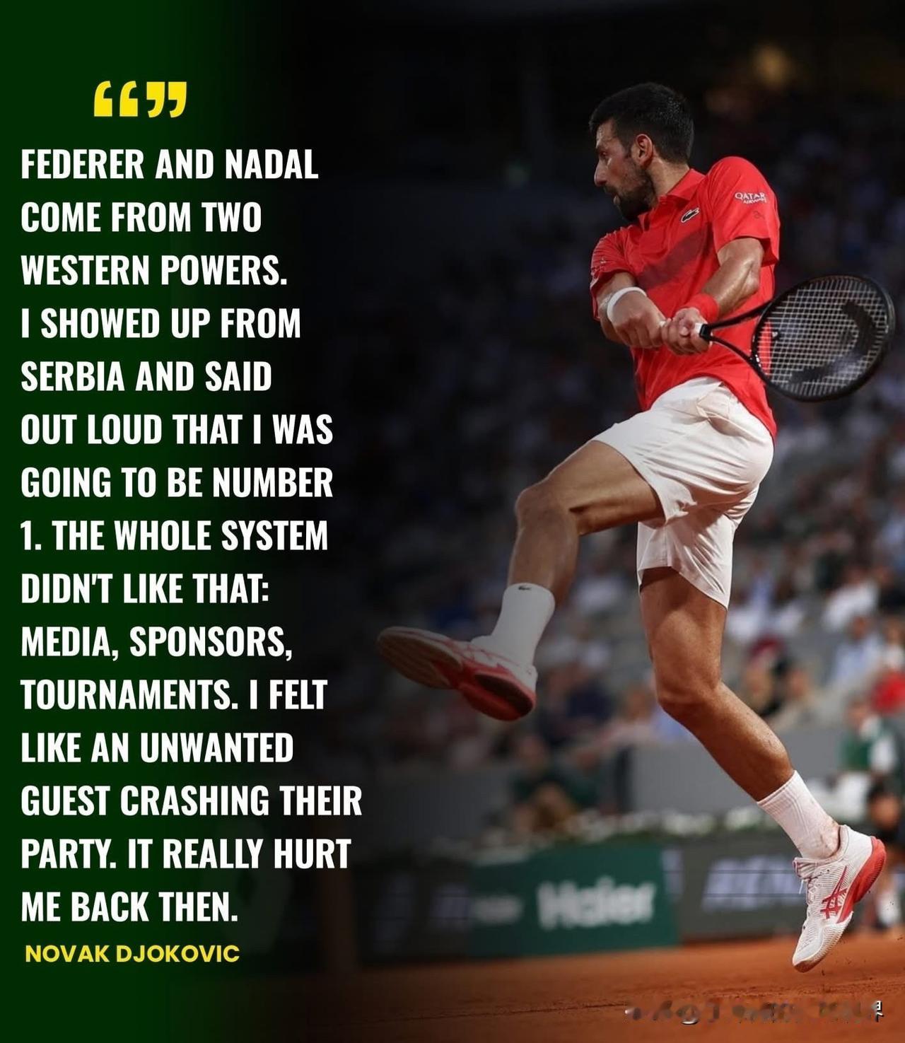 德约科维奇透露自己不如费德勒和纳达尔受欢迎的原因是因为国籍:“费德勒和纳达尔来自两个西方强国,我从塞尔维亚来到这里,大声宣布我要成为世界第一。整个体系都不喜欢这样:媒体、赞助商、 赛事组织者。我感觉自己个不速之客,闯入了他们的派对,当时这真的让我很受伤。 我不认同德约科维奇的说法,费德勒并非来自网球强国,瑞士在网球界,尤其是在ATP,从未成为过主流,德约科维奇总是过度利用弱者逆袭的形象。