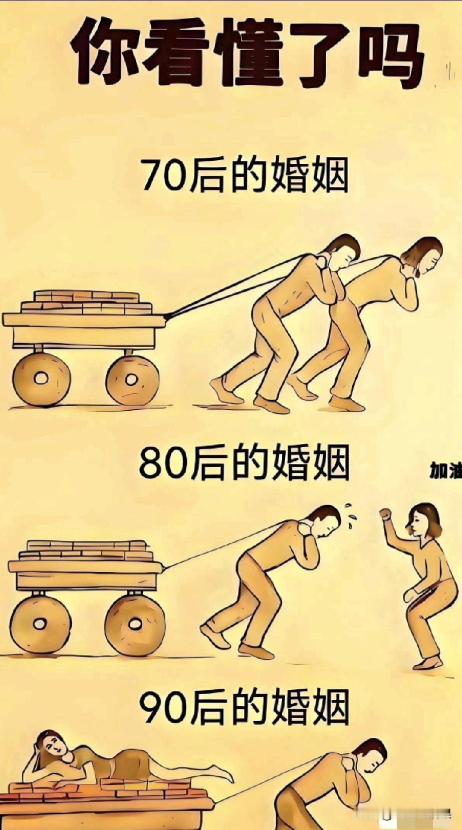 网友绘制的这张图,太符合现实了,看得懂的都是人生阅历很深的人。 曾经的婚姻,其实是两个人共同努力把一个新组建的家搞起来,精心的培养下一代。 到我们90后这一代,婚姻直接变成了买卖,男方给女高额的彩礼是前提,很像购买商品一样交易,更重要的是,还没有品质保障。 因为变成了交易,又没有品质保障,现在很多都选择了单身。后续只能寄托,00后或者10后甚至20后来破局了。 大家分析一下,有没有破局的可能。