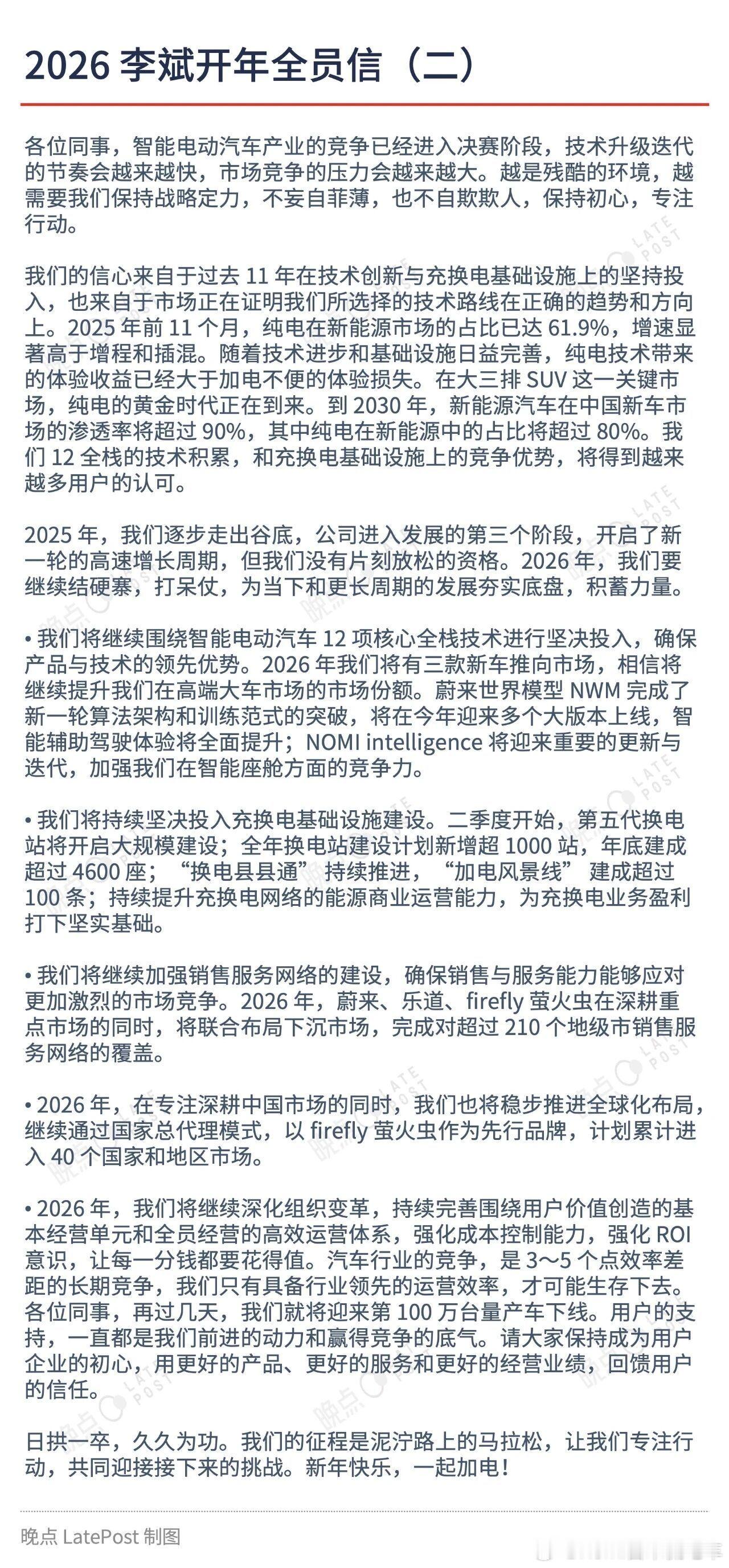 今天媒体曝出了斌哥发给蔚来全体员工的内部信,信息量很大,推荐所有关注蔚来、关注智能电动汽车行业的朋友们仔细研究。这封题为“日拱一卒,久久为功”的公开信,系统阐述了斌哥对未来5到10年新能源汽车行业发展的战略思考。它不仅展现了他对行业趋势的深刻洞察,也清晰传递了蔚来下一阶段的发展路径——既充满信心,又饱含紧迫感。首先,从战略层面,斌哥再次强调“结硬寨、打呆仗”的定力。他指出,在决赛圈阶段,任何短期投机或概念炒作都不可持续。企业必须沉下心来夯实底层能力——包括全栈自研技术、用户服务体系、智能制造体系和高效组织机制。这种“笨功夫”看似缓慢,却是穿越周期、构建长期竞争力的关键。斌哥特别强调,蔚来的技术路线是以十年为单位思考的,必须坚持对纯电与换电生态的长期投入,不能因短期波动动摇方向。其次,在行业判断上,斌哥对纯电路线展现出坚定信心。基于2025年1–11月纯电在新能源市场占比已达61.9%、纯电大三排SUV连续三个月销量超越增程与插混等数据,他明确判断:“纯电大三排的黄金时代已经到来”,且更多细分市场将陆续迎来“纯电拐点”。他预测,到2030年,新能源渗透率将达90%,其中纯电占比高达80%。尽管当前存在阶段性挑战,但电动化、智能化的大趋势不可逆转。蔚来将继续聚焦高端纯电赛道,依托全栈自研、换电网络和用户社区三大核心优势,打造难以复制的差异化壁垒。最后,在战术执行层面,斌哥提出五项关键行动:1、坚持技术创新,围绕智能电动汽车12项核心全栈技术坚决投入;2、坚决推进充换电基建,2026年新增1000座换电站(总数超4600座),建成超100条“加电风景线”;3、加强销售服务网络,蔚来、乐道、Firefly萤火虫联合覆盖超210个地级市,深耕下沉市场;4、推进全球化布局,计划进入40个国家和地区,萤火虫作为“排头兵”率先出海;5、深化组织变革,建立以用户价值为中心的高效运营体系。整体而言,斌哥传递的核心信息是:前景光明,但道路曲折。蔚来已进入“决赛圈”,竞争将更加体系化,任何一个环节的松懈都可能影响全局。因此,必须继续“结硬寨、打呆仗”,保持定力、提升韧性,日拱一卒,久久为功——因为纯电一定是未来,而蔚来,也一定会有未来。大家一起加电,新年快乐蔚来汽车
