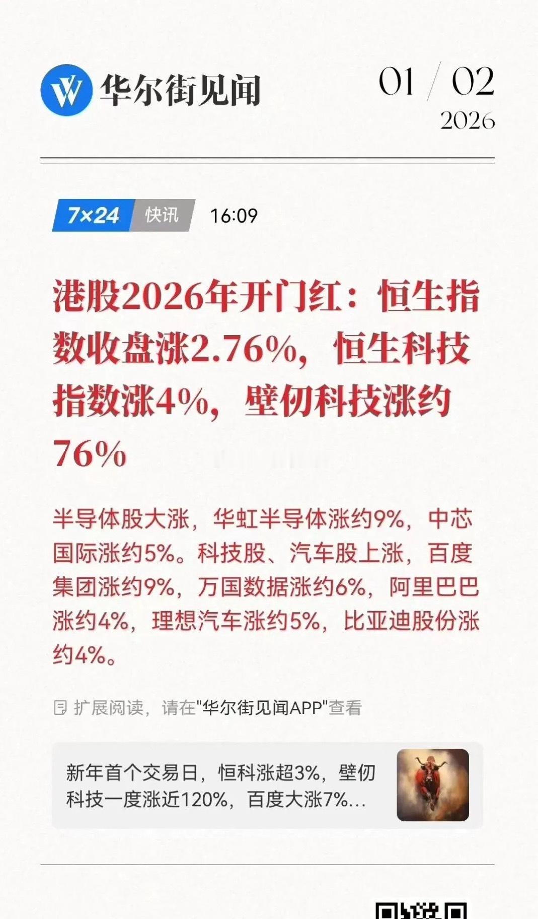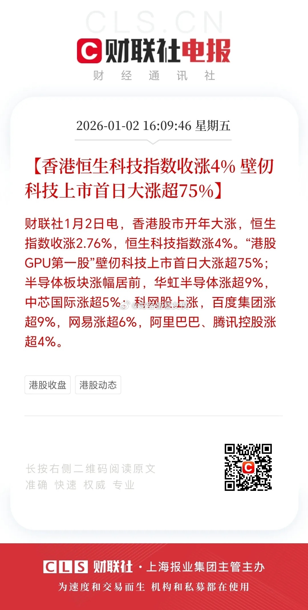 2026年元旦假期港股和A50的表现太惊艳,让人对节后A股开门红充满期待。假期第二天A股休市时,港股强势拉升,午盘恒生指数涨2.14%,恒生科技指数暴涨3.32%;富时中国A50期货直线拉升超100点。“港股GPU第一股”壁仞科技上市首日开盘涨82%,半导体、互联网等板块表现亮眼,华虹半导体涨超10%,百度集团大涨超8%。港股大涨一方面是A股休市,资金流入;另一方面其自身也有上涨基础。市场这次联动大涨或许是聪明资金对全年中国资产配置的预演,感觉A股新年开门红稳了!股票