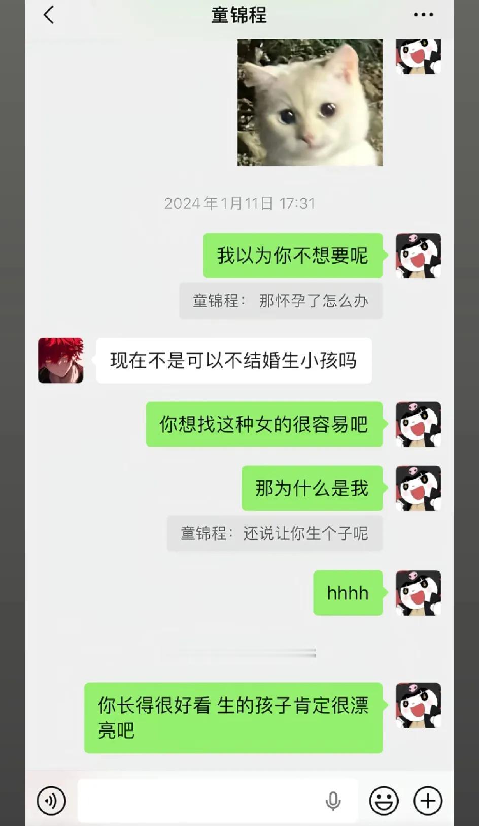 江南第一深情童锦程私生子风波:从他们刚认识的聊天记录来看,是童锦程想让女方帮他生孩子的呀。童锦程说想不结婚,跟她生个小孩也挺好。这女的就说像你颜值这么高,生的小孩一定很可爱,但想跟你生孩子的女人很多吧,你为什么非要找我呢?我们现在相处的还不久,等相处久了再说吧!我不想意外怀孕,我想有准备的生个孩子。就在今年初,女的还真怀上了,女的是福建人,今年30岁了,怀上了之后她想要。童锦程却不想要了,所以男人的心变化之快呀。