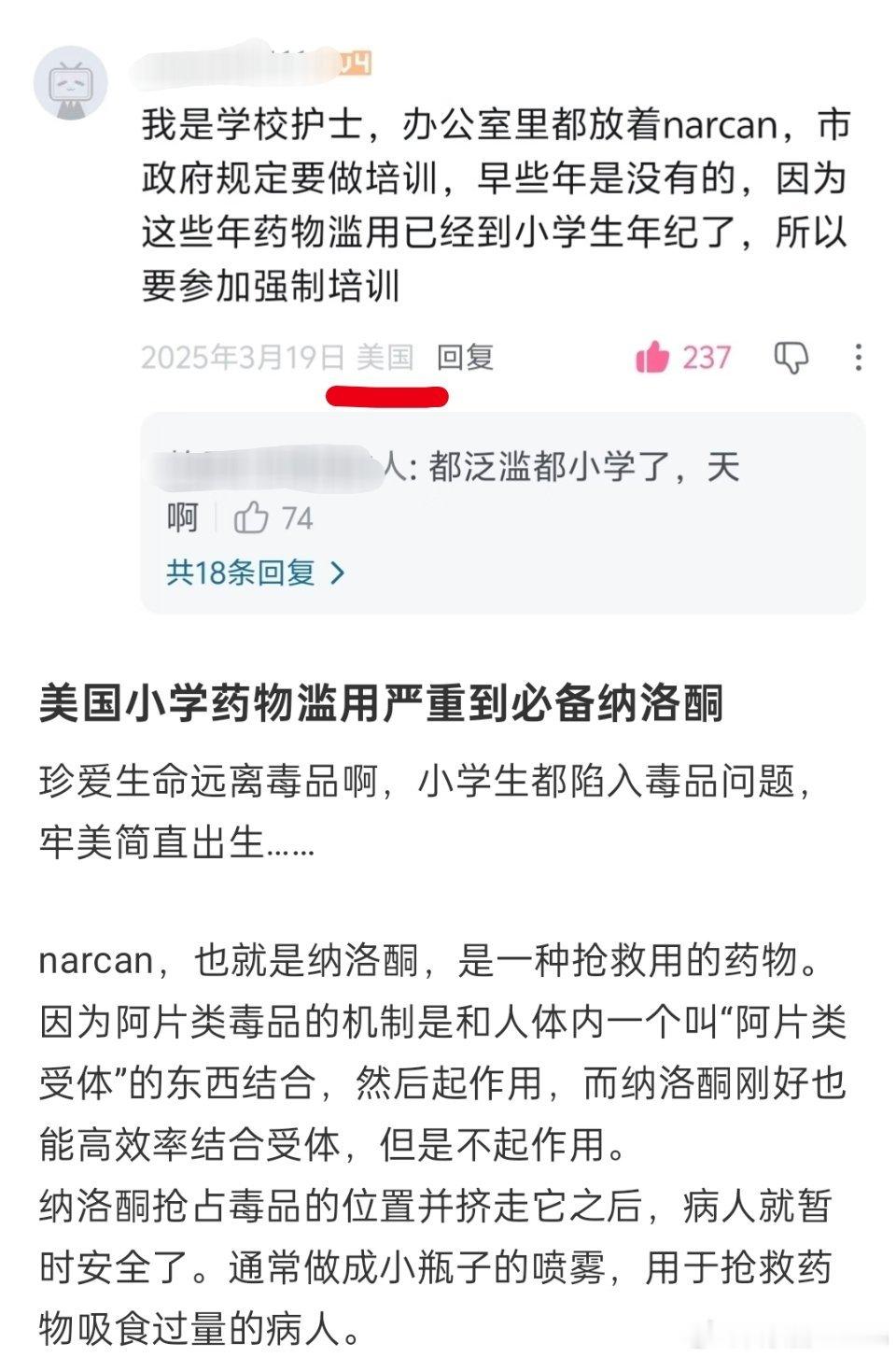 🔻美国小学药物滥用,严重到美国小学要必备纳洛酮了。用于抢救药物吸食过量的病人美国斩杀线现象海外新鲜事