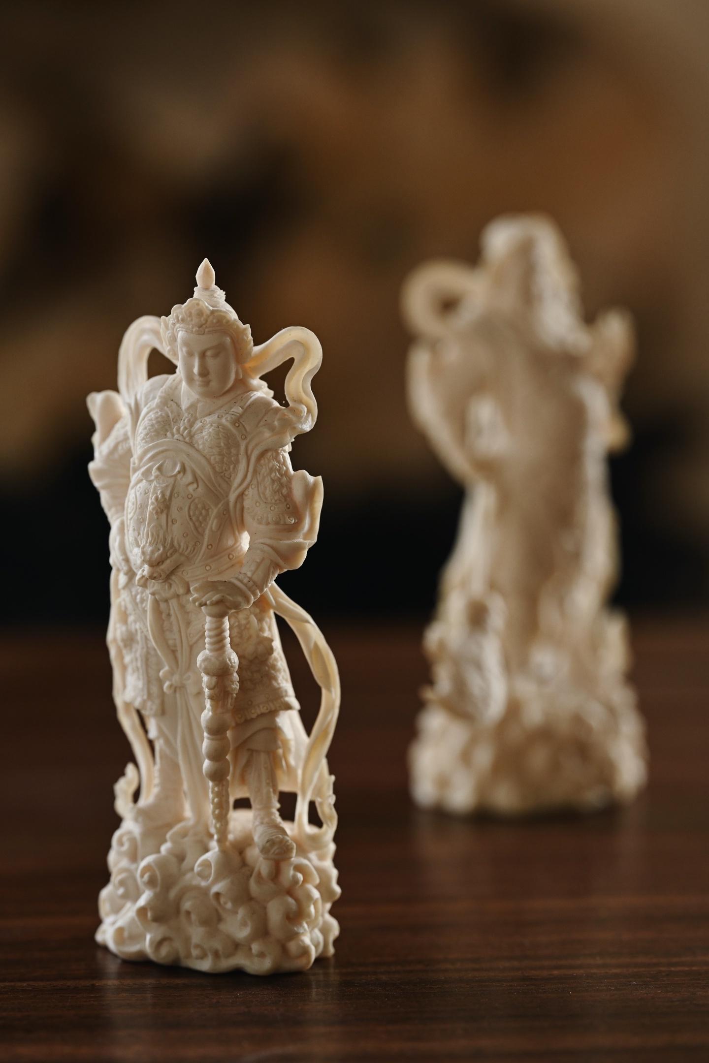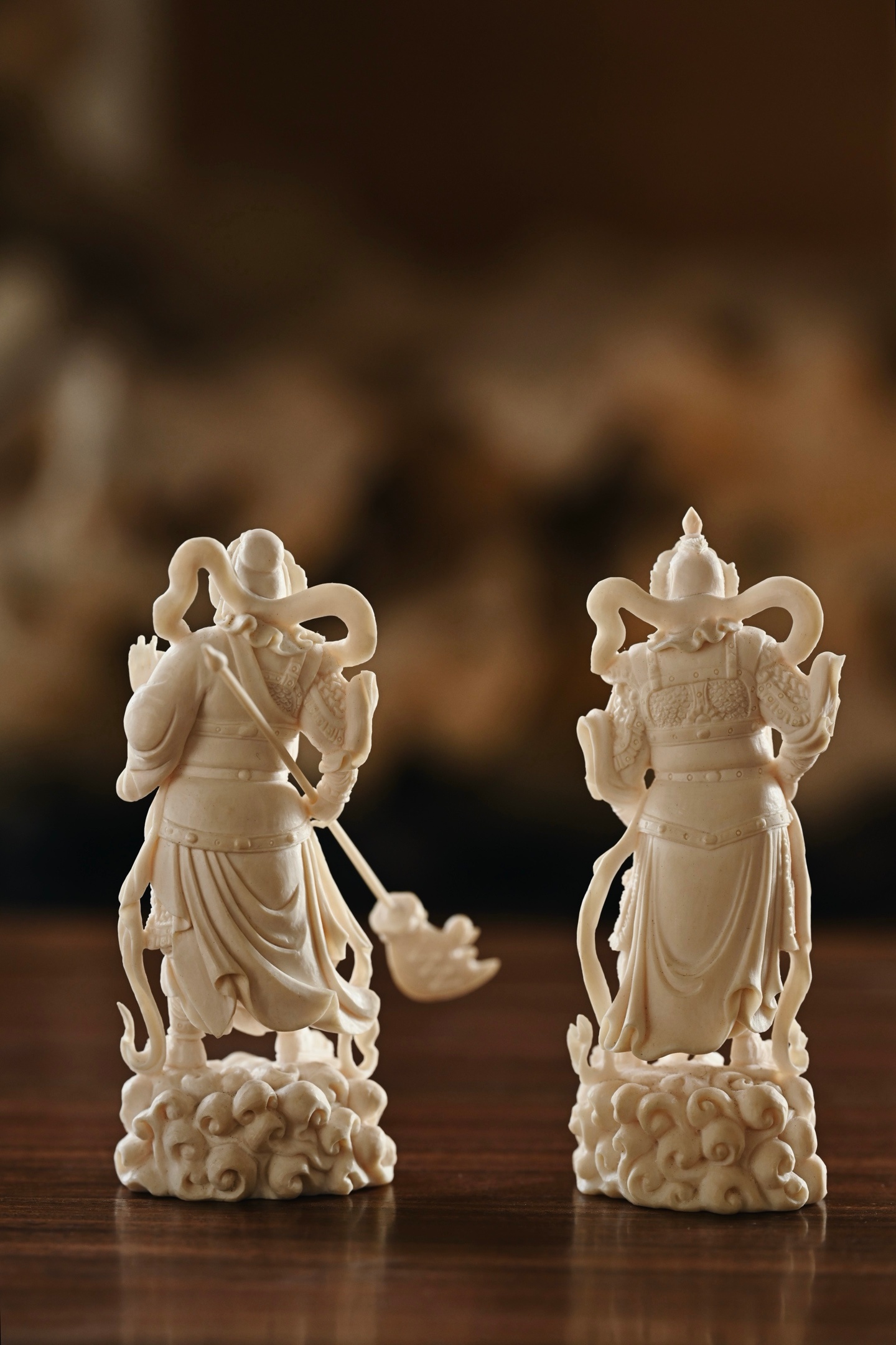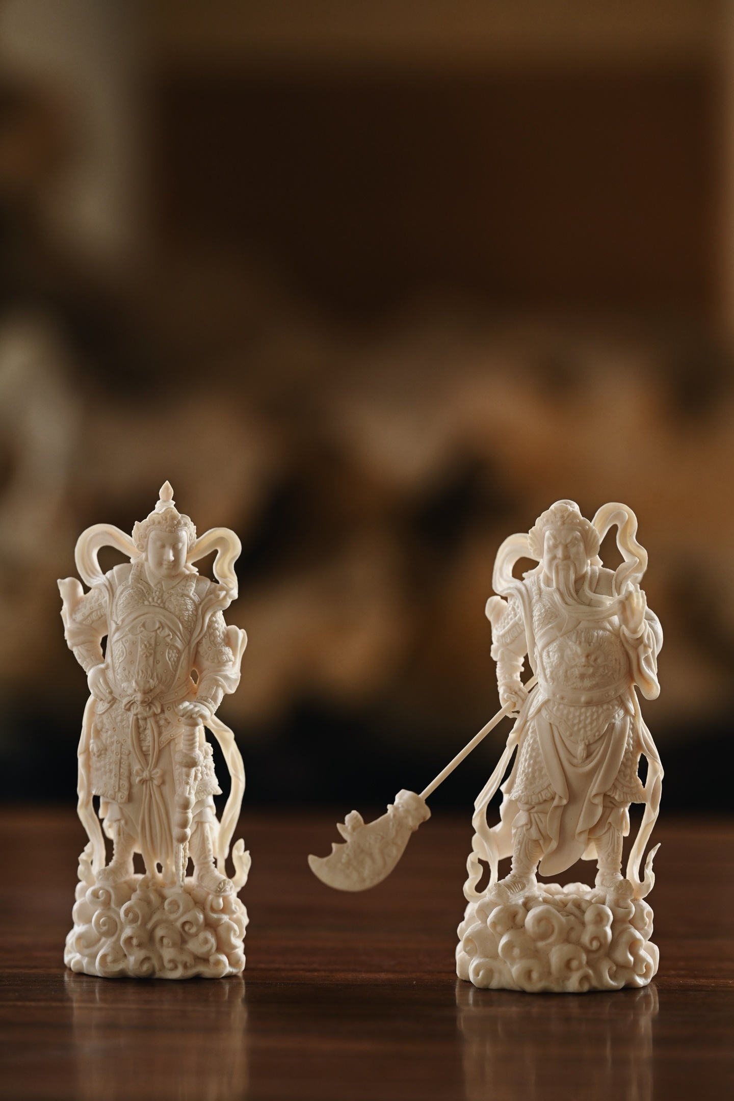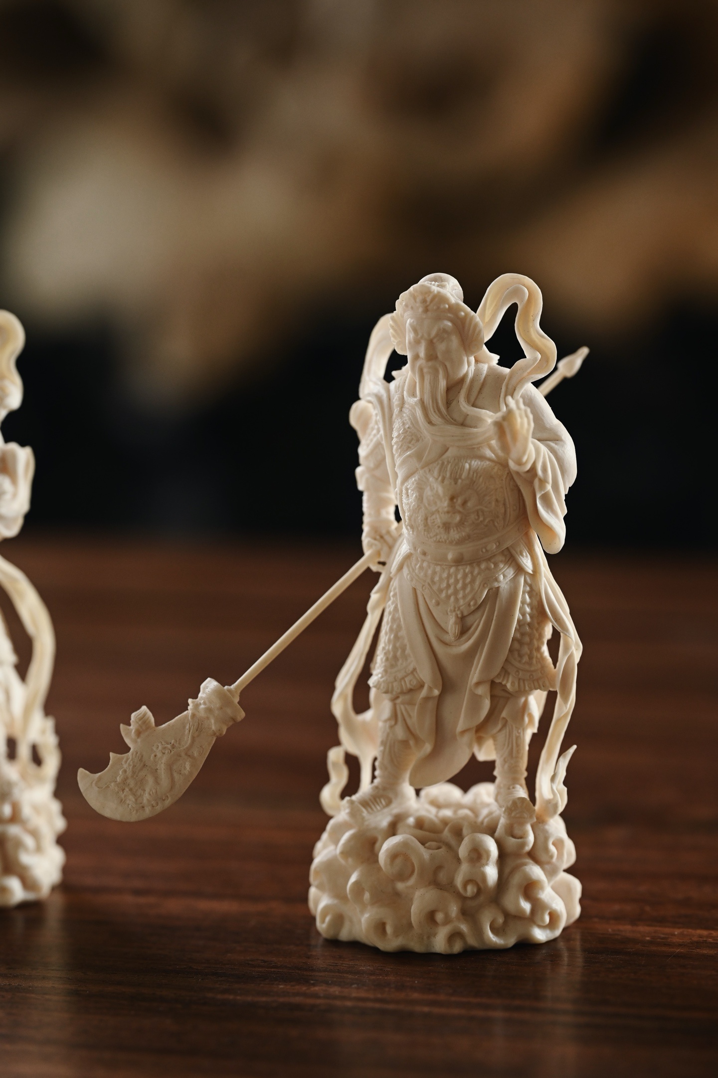 猛犸 | 伽蓝、韦陀 一对择选清润好料雕刻,韦陀身穿甲胄,手拄金刚杵,威风凛凛。伽蓝铠甲覆身,手握青龙偃月刀,足踏云靴,不怒自威,造像庄严肃穆,气度威严。韦陀4*3.2*10.3cm 64g关公4.3*3.5*10cm 68g