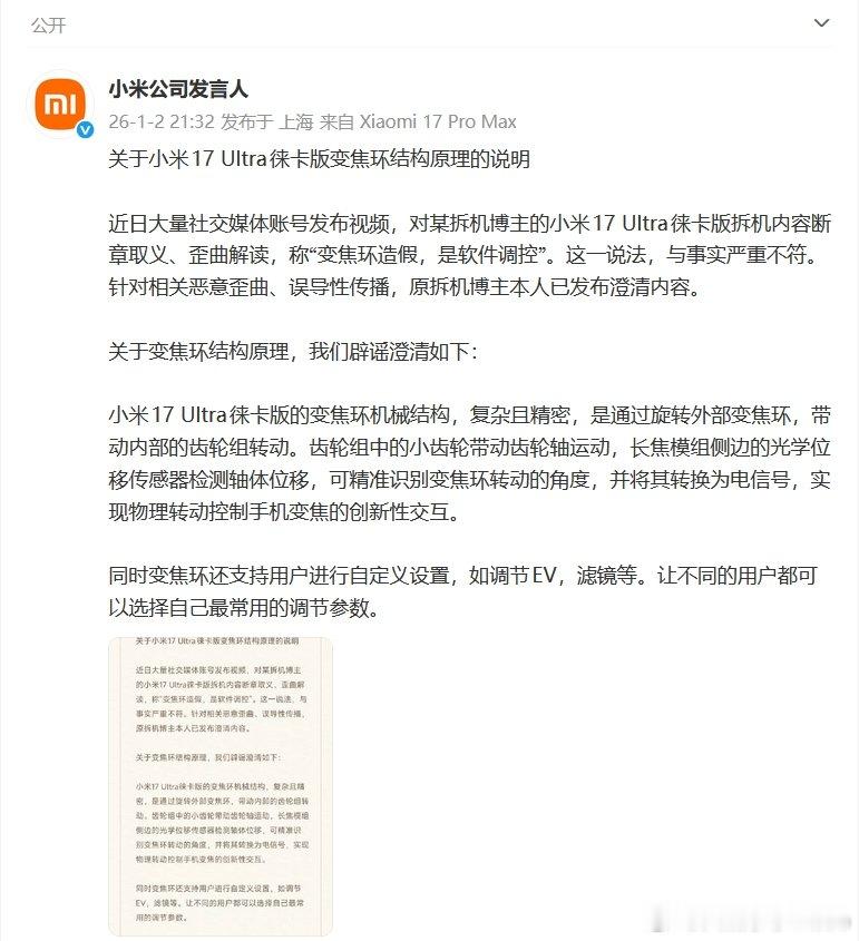 【小米回应变焦环争议小米辟谣变焦环造假】1月2日,发布关于小米17 Ultra徕卡版变焦环结构原理的说明:近日大量社交媒体账号发布视频,对某拆机博主的小米17 Ultra徕卡版拆机内容断章取义、歪曲解读,称“变焦环造假,是软件调控”。这一说法,与事实严重不符。针对相关恶意歪曲、误导性传播,原拆机博主本人已发布澄清内容。关于变焦环结构原理,我们辟谣澄清如下:小米17 Ultra徕卡版的变焦环机械结构,复杂且精密,是通过旋转外部变焦环,带动内部的齿轮组转动。齿轮组中的小齿轮带动齿轮轴运动,长焦模组侧边的光学位移传感器检测轴体位移,可精准识别变焦环转动的角度,并将其转换为电信号,实现物理转动控制手机变焦的创新性交互。同时变焦环还支持用户进行自定义设置,如调节EV,滤镜等。让不同的用户都可以选择自己最常用的调节参数。