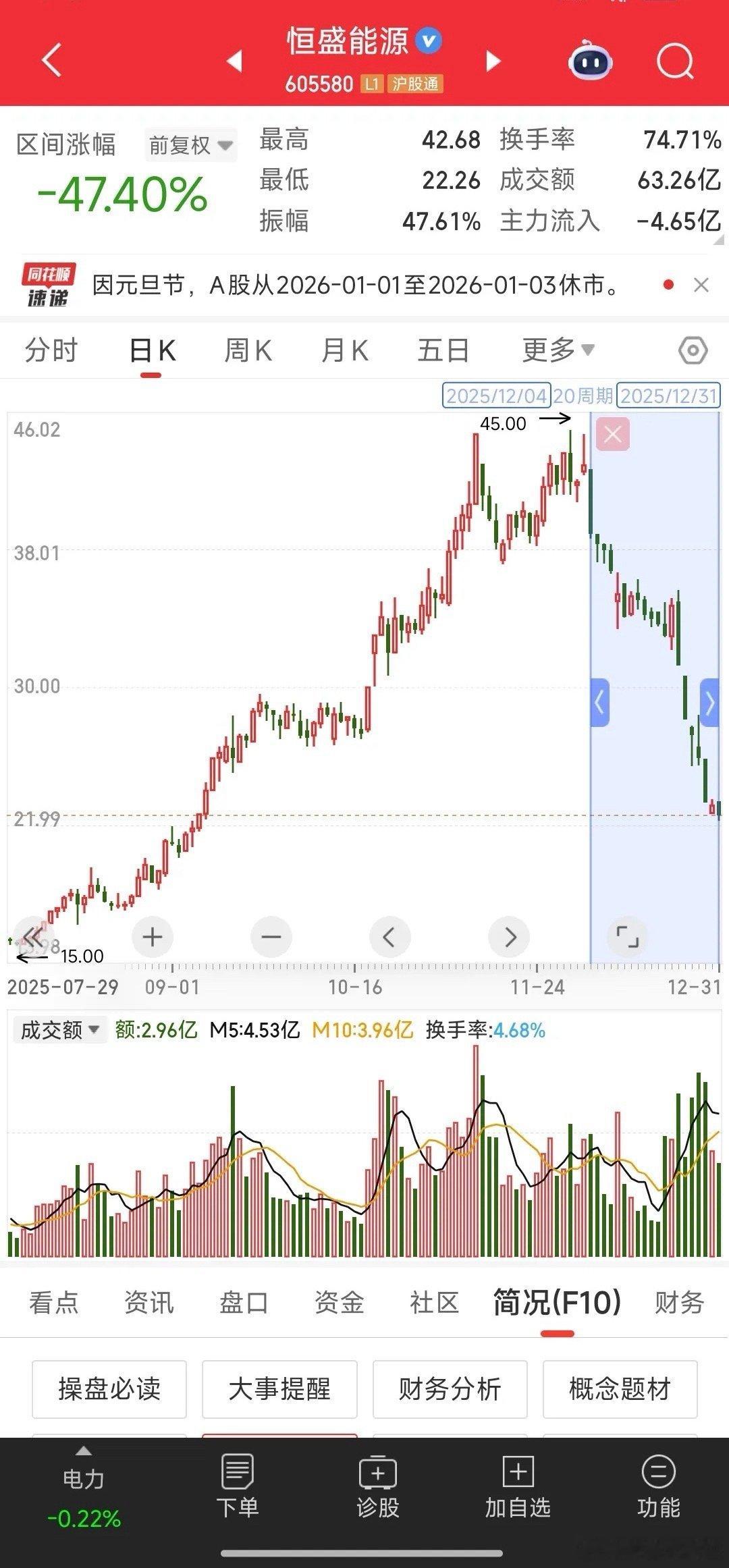 电力板块跌的最狠的票诞生了短短一个月的时间股价腰斩就问你们怕不怕该票从去年12月4号掉头直下仅仅20个交易日跌幅47.40%不得不说这主力砸的太猛了追高买进的资金账户腰斩了可能有人会说这么惨的跌法谁会傻傻的拿着不卖呀其实大部分人被套后是躺平的不仅不卖还会加仓别看那些炒的火热的题材主力只是把钱暂时放在你那一旦开启出货模式,十有八九都会还回去的市场很残酷,只能乐观点了