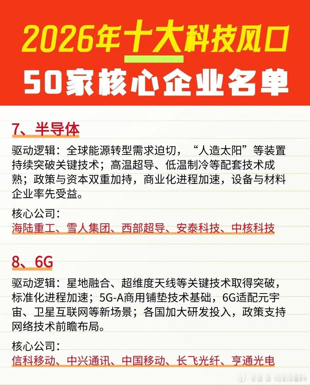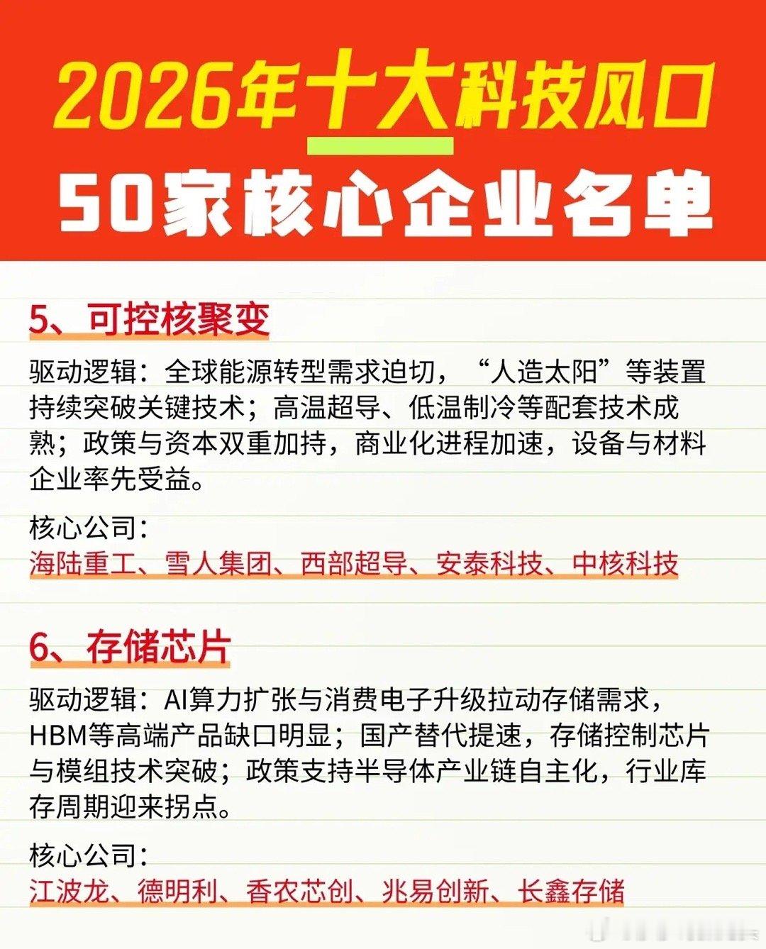 2026年十大科技风口及核心企业如下:1. 人形机器人:核心零部件技术突破+特斯拉Optimus量产+AI算法赋能+政策支持,核心公司:绿的谐波、汇川技术等。2. AI算力:大模型算力需求指数增长+英伟达H200与国产GPU互补+“东数西算”推进,核心公司:寒武纪、中际旭创等。3. 商业航天:低轨卫星互联网提速+火箭回收/卫星量产降本+全链条订单爆发,核心公司:中国卫星、中国卫通等。4. 智能驾驶:L3级自动驾驶商用试点+核心部件成本下降+车路云一体化,核心公司:长安汽车、禾赛科技等。5. 可控核聚变:能源转型需求+“人造太阳”技术突破+配套技术成熟+政策资本支持,核心公司:海陆重工、雪人集团等。6. 存储芯片:AI/消费电子升级拉动需求+HBM高端缺口+国产替代突破,核心公司:江波龙、德明利等。7. 半导体:同可控核聚变驱动逻辑(注:原文重复),核心公司:海陆重工、雪人集团等。8. 6G:星地融合/超维度天线突破+5G-A铺垫+适配新场景+各国研发,核心公司:信科移动、中兴通讯等。9. 液冷:算力密度提升散热需求+液冷能效优势+绿色算力政策推动,核心公司:英维克、中科曙光等。10. 光刻机:半导体自主化需求+国产DUV提升+零部件国产化+政策扶持,核心公司:中芯国际、张江高科等。