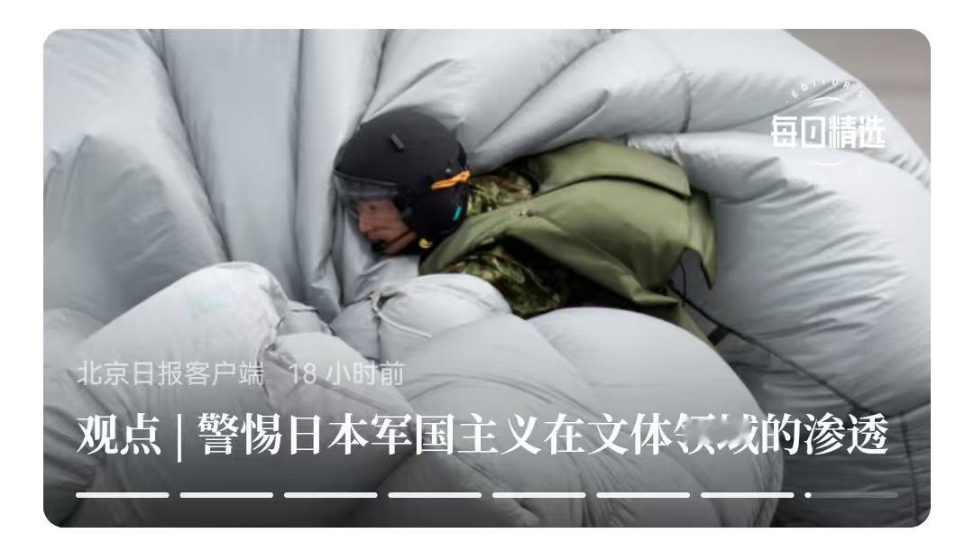 这篇《警惕日本军国主义在文体领域的渗透》的文章写的好,恰恰反映了现在出现的各种“偶然日本元素”的原因,日本的小心思经常出现。 把恶灵通过各种文化体育经济,悄悄描绘篡改为“英灵”,把日本侵略的标志性文化掺在各种交流、传媒和会议甚至活动上,貌似不经意,实则是温水煮青蛙的把罪恶给“削平”。 每个国人和一切爱好和平并尊重历史的人,都要防止日本“玩这一手”,及时揭批,甚至要立法,及时处置。