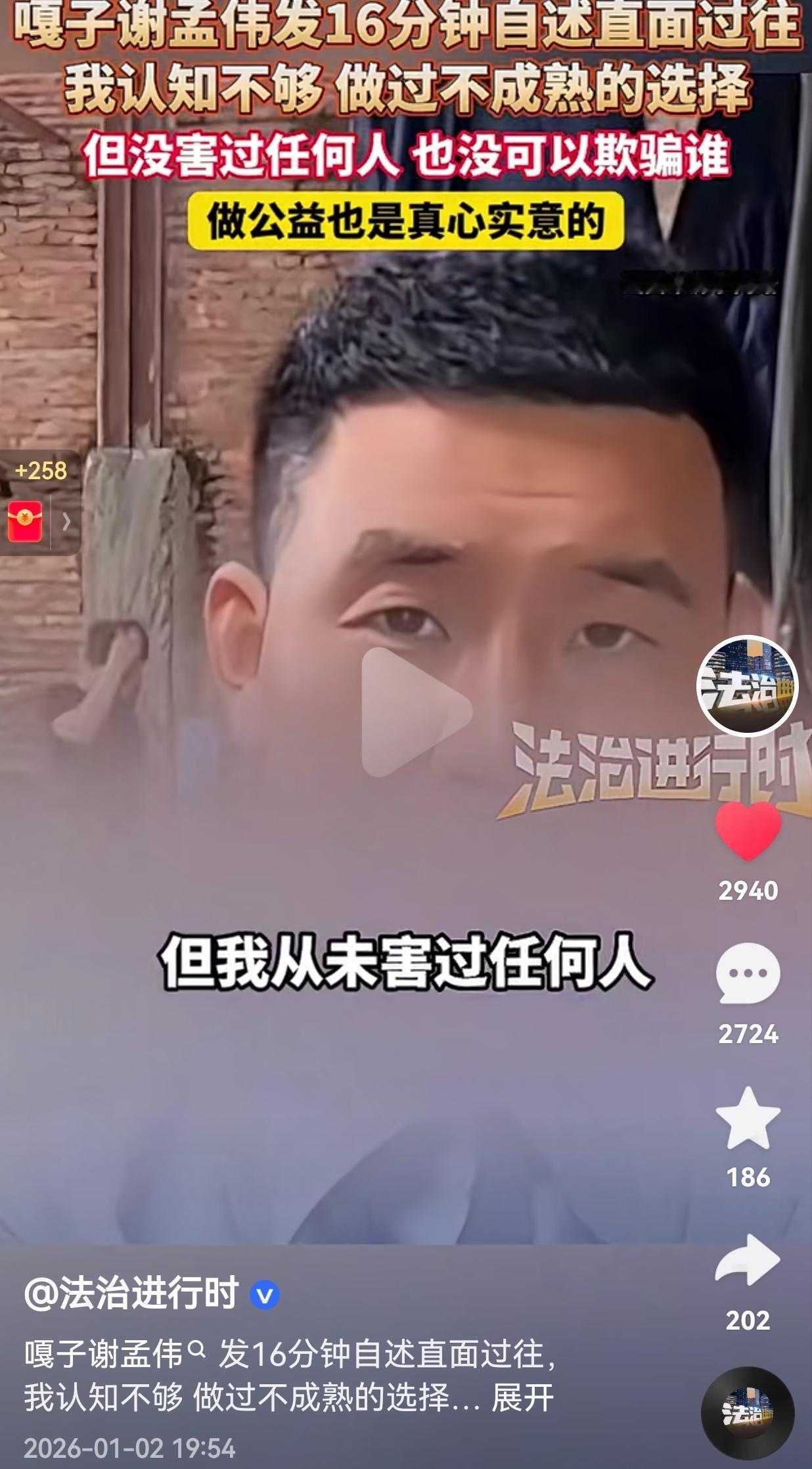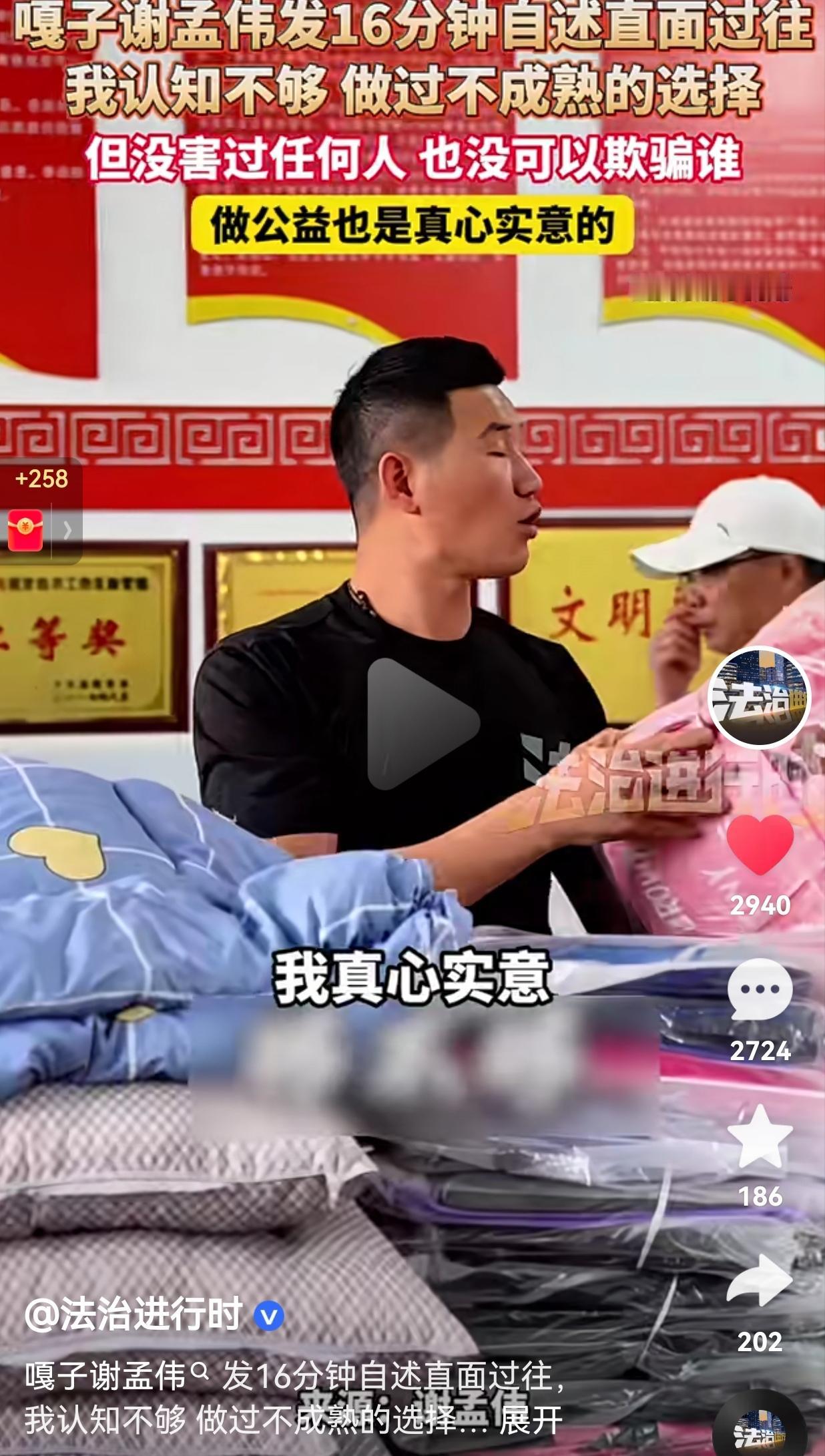 希望你说到做到!别再辜负网友对你的信任了!嘎子谢孟伟发16分钟自述直面过往,他说:我承认认知不够,做过不成熟的选择但我没有害过任何人,也没有欺骗谁,做公益也是真心实意的。网友:嘎子这话说得实在!谁还没年轻糊涂过,错了敢认就比那些嘴硬的强多了! 嘎子谢孟伟甩出一条16分钟的自述视频,把这些年的磕磕绊绊全摊开了说。 他说自己当初就是认知不够,压根摸不透互联网的门道,年轻气盛选了不少糊涂路,硬是把一手好牌打得稀巴烂。 但他也认死理:从没害过谁,也没刻意骗过谁。带货那阵子,他说自己拼了命去盯产品质量。做公益,更是实打实掏心掏肺,没掺半点假。 其实咱观众心里跟明镜似的,从来不是容不下谁犯错。真正膈应人的,是那些犯了错还藏着掖着,把良心揣进裤兜里的人。 嘎子敢把自己的错摆在明面上,更没丢了做人的底线,就冲这点,他就比那些嘴上说得漂亮、背后净耍猫腻的人强多了。 人生这趟路,哪有顺风顺水的?摔跟头不算啥,可怕的是摔下去就赖在地上不起来,还把最值钱的良心给扔了。 嘎子这一番掏心窝子的话,倒是让咱想明白了一件事:做人,本事大小真不是顶要紧的,守住本心才是最根本的道理。