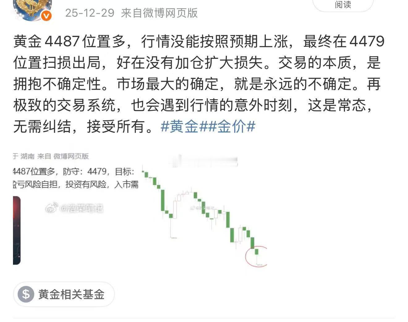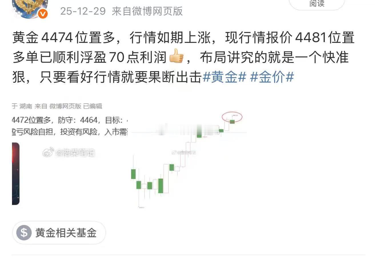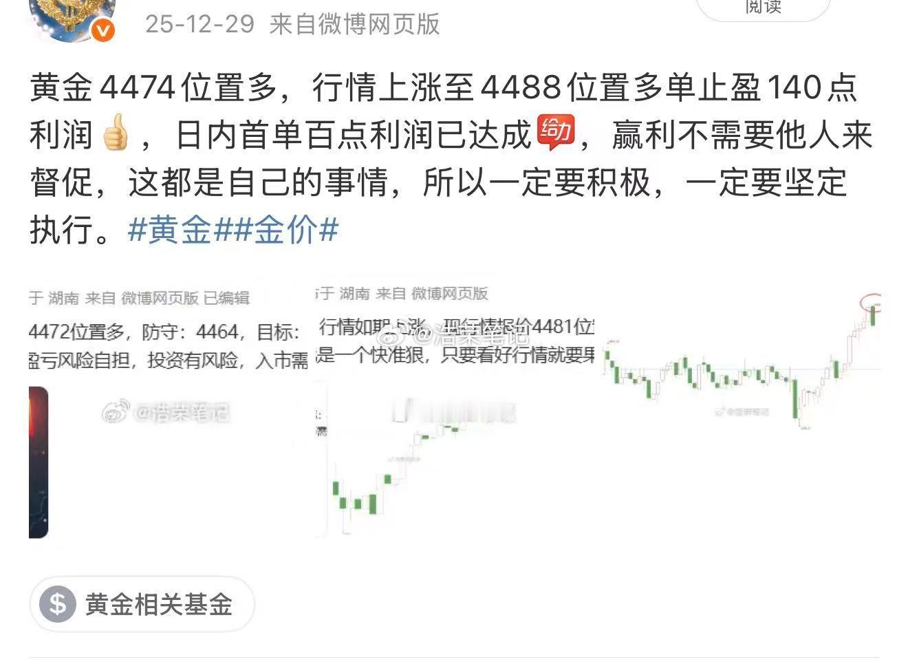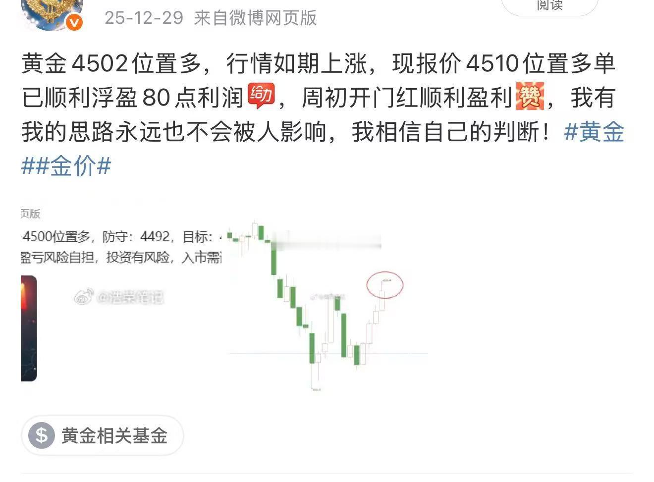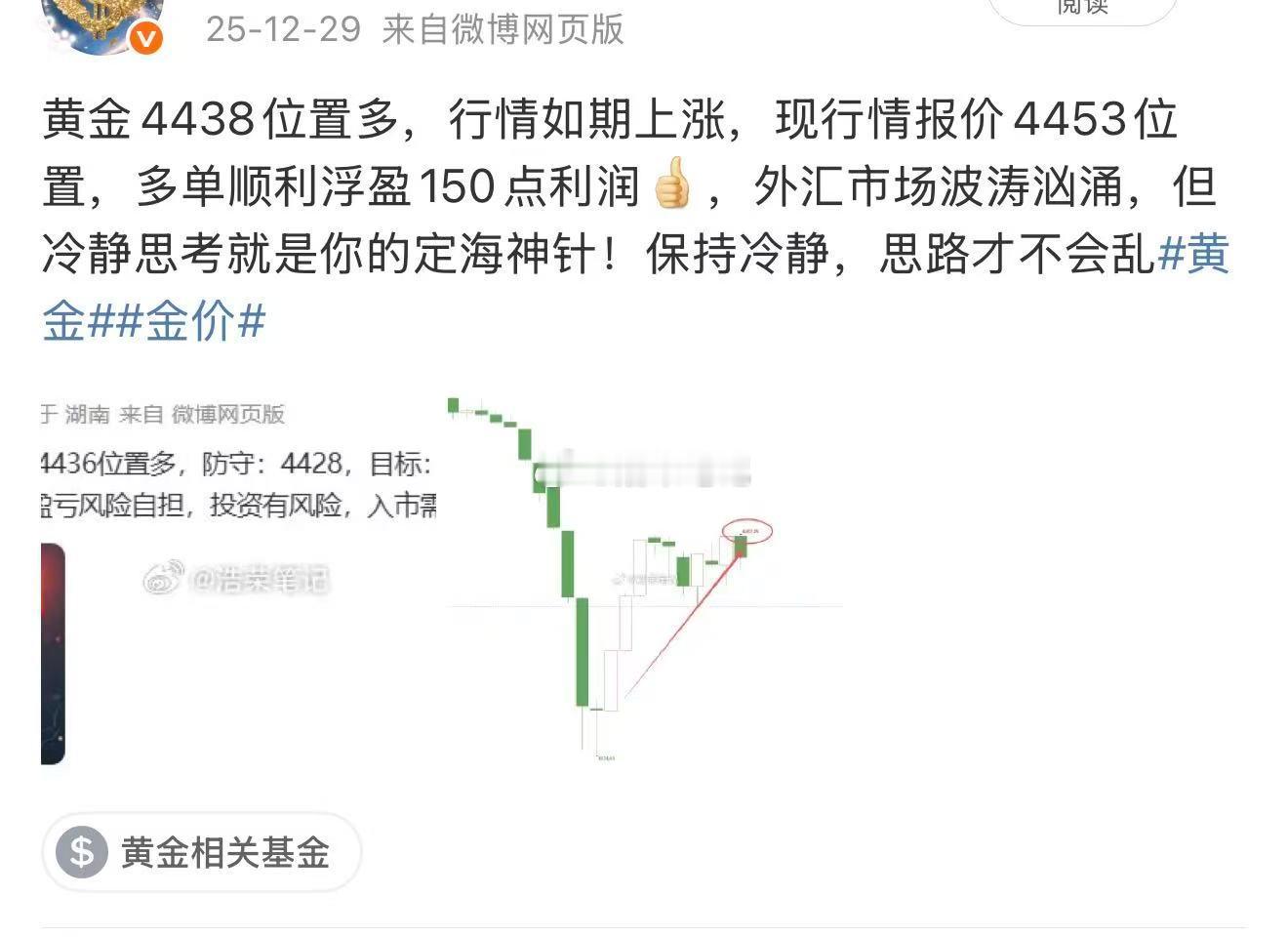 2025.12.23日周二操作记录总结!黄金4502位置多,在4510位置获利80点利润黄金4487位置多,在4479位置扫损出局黄金4474位置多,在4488位置获利140点利润黄金4438位置多,在4467位置获利290个点利润黄金4423位置空,在4400位置获利230点利润博文公布5单,4胜1负,共斩获660点利润,市场没有绝对,涨跌没有定势,所以,对市场行情的涨跌平衡判断就是你的制胜法宝黄金 金价 !