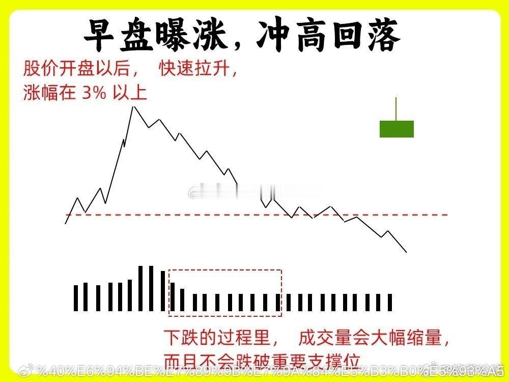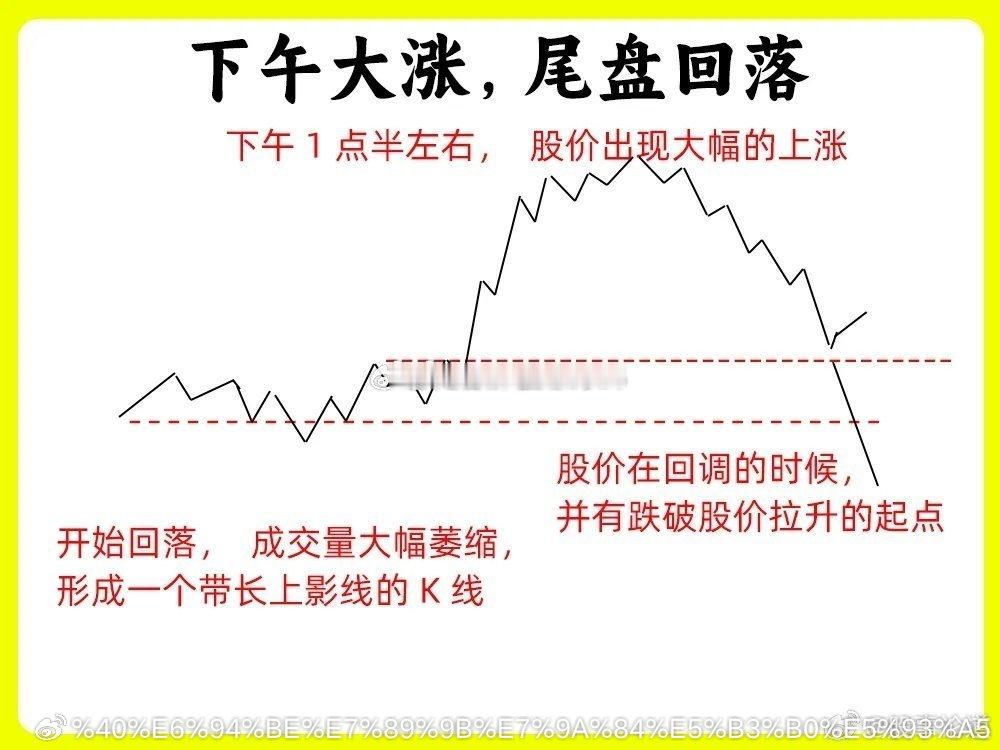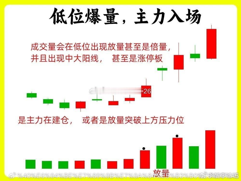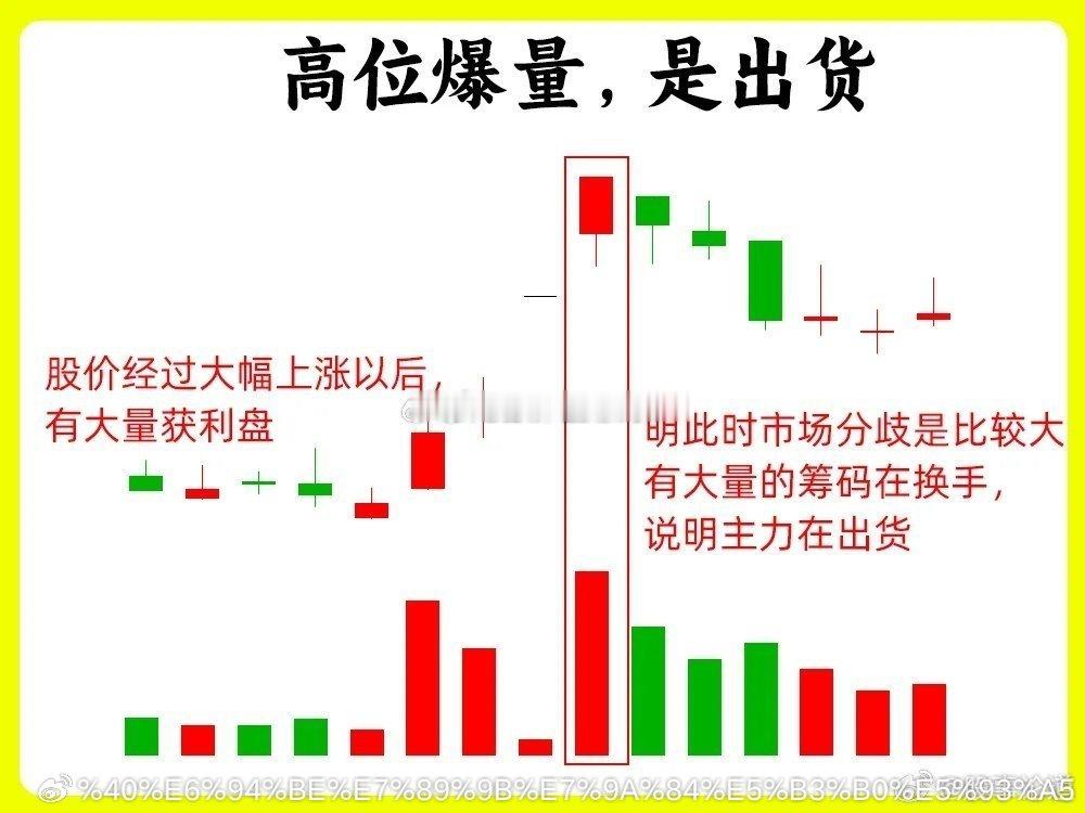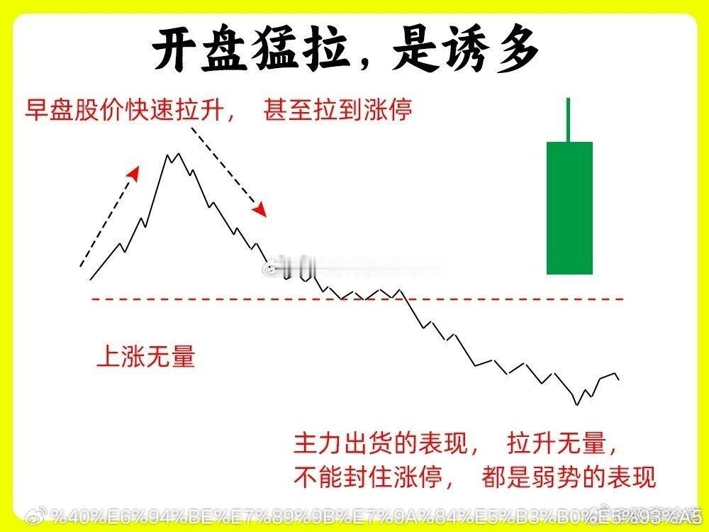 注意了!这是一个最笨最土的口诀,很多人为了想提高认知,往往都会去记忆它!炒股高手经过长时间积累下来的经验所得,如果你也想判断主力此时操作痕迹,这期内容一定要认真看完,能大大提高你的盘感能力。我总结了八条最为重要的内容,一次分享给大家还是老规矩,点赞收藏或评论六六六支持一下,牢记每天分享炒股干货,以免以后想温习找不到了。口诀好记忆,但是要理解背后逻辑才是最为重要的一、早盘暴涨,冲高回落早盘的一个小时,是全天里最为重要的时间段之一。股价开盘以后,快速拉升,涨幅在3%以上,可能涨停,随后股价开始下跌,全天的涨幅会在2%以下,也有可能翻绿。往往这是主力的洗盘或是诱多。如果是主力洗盘,往往下跌的过程里,成交量会大幅缩量,而且不会跌破重要支撑位,所以成交量的变化就变得格外重要二、早盘急跌,是洗盘这种形态比较经典和常见。股价开盘以后快速向下,尤其是开盘的半小时内,但是下跌过程中成交量并没有放大,出现无量下跌,随后股价开始缓慢上涨,放出量能,回到原来价格区间,这是主力洗盘的手法之一,在整个过程里,我们在日K线来看,不会跌破前期的低点、五日均线或是平台下沿,这些都是重要支撑点。三、开盘猛拉,是诱多早盘股价快速拉升,甚至拉到涨停,这个过程里,成交量并没有放大,活跃度很低,随后股价开始下跌,形成一个大阴线,这其实就是主力出货的表现,拉升无量,不能封住涨停,都是弱势的表现。四、尾盘突涨,看次日个股全天走势比较弱,突然在尾盘三十分里,尤其是最后十分钟,股价突然拉升,大幅上涨。尾盘拉升往往都是主力不够强势不够坚决的表现,让人措手不及。所以次日的行情就值得关注,是否有比较强的承接力量,股价会不会回落,如果承接力量弱,可能主力就会继续洗盘五、低位爆量,主力入场股价经过长期的阴跌以后,成交量会在低位出现放量甚至是倍量,并且出现中大阳线,甚至是涨停板,往往是主力在建仓,或者是放量突破上方压力位。如果是下跌趋势中继出现爆量,就需要谨慎了,趋势并没有用发生改变六、高位爆量,是出货股价经过大幅上涨以后,有大量获利盘。股价在高位出现放量,出现巨量和天量,比股价加速期的成交量还要大,说明此时市场分歧是比较大,有大量的筹码在换手,说明主力在出货了。我们最为常见的形态就是,当天高开低走,形成一个大阴线七、低位无量,要等待股价长时间下跌以后,成交量出现逐步的缩量,成交量越小说明市场活跃度越低,此时低位无量,市场关注比较低,我们关注的意义就不大,往往经过长时间横盘,等到以后选出市场方向八、 尾盘跳水,看次日修复股价在尾盘三十分钟里,如果开始大幅下跌,跌幅在3%以上。如果次日出现低开后快速上涨,把这天下跌幅度会涨回来,往往这是主力故意的砸盘,是洗盘手法。次日不能修复往往就是主力比较弱势九、下午大涨,尾盘回落在下午1点半左右,股价出现大幅的上涨,而且成交量放出量能,等到尾盘三十分钟的时候,股价开始回落,成交量大幅萎缩,形成一个带长上影线的K线,往往这个主力的洗盘。这里有一个细节,股价在回调的时候,并有跌破股价拉升的起点,这个一个关键点位。如果拉升阶段出现无量拉升,就要谨慎一些好了!以上就是今天要分享的九句口诀,判断主力洗盘还是出货,提高认知。下方的八张案例图,一定要牢记,希望这期内容对你有帮助或者启发,记得帮道哥点赞转发出去,我们下期内容再见今日看盘股票