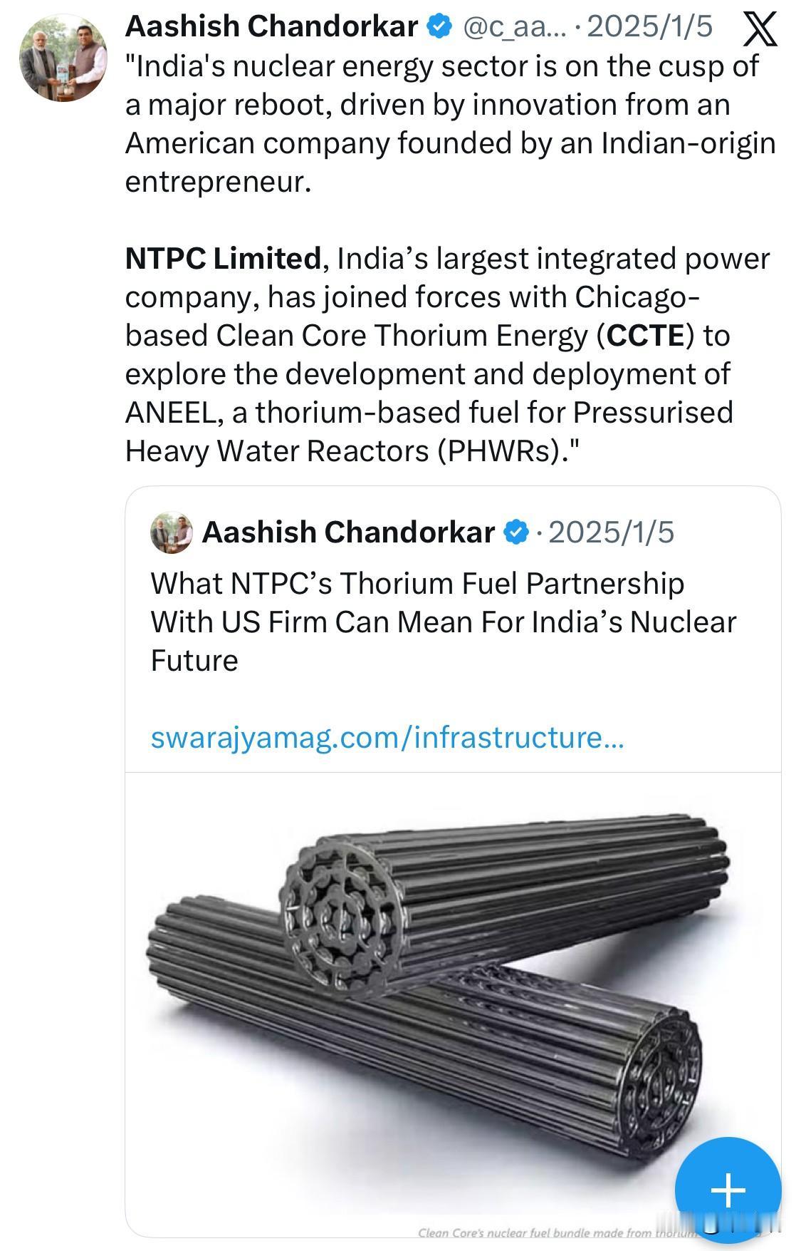 总部位于芝加哥的清洁核心钍能源公司 (CCTE) 是近二十年来第二家获得美国能源部出口许可证向印度出售核技术的美国公司,该公司将与印度最大的电力公司 NPTC Ltd 合作,开发钍作为铀的替代品,用于核反应堆燃料。 这一消息标志着美印民用核能合作的重大突破。以下是该合作的核心要点: 里程碑式的许可:清洁核心钍能源公司(Clean Core Thorium Energy, CCTE)成为近 20 年来第二家获得美国能源部 (DOE) 出口许可、向印度提供核技术的美国企业。 核心技术:CCTE 研发了名为 ANEEL 的专利燃料。这是一种将钍与低浓缩铀(HALEU)结合的先进燃料,旨在通过利用印度丰富的钍资源,降低核废料产量并提高反应堆的安全性与效率。 战略合作伙伴:CCTE 将与印度最大的电力生产商 NTPC Limited 合作。双方计划在印度的加压重水反应堆(PHWR)中测试并部署这种钍基燃料。 政策背景:此项合作不仅有助于印度实现其三阶段核能发展计划(该计划长期以利用钍资源为核心),也符合美印两国在关键和新兴技术倡议 (iCET) 框架下加强清洁能源合作的战略目标。