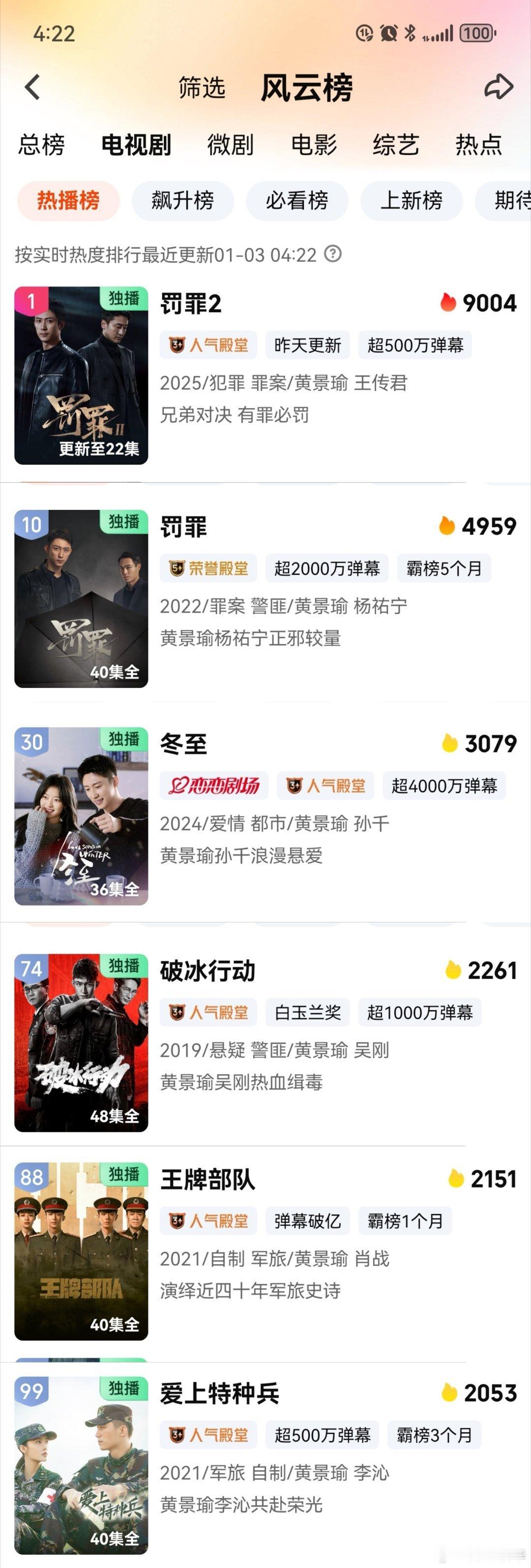 早上起来看了一眼,此刻在爱奇艺热播榜的黄景瑜作品6个,罚罪2、罚罪、冬至、破冰行