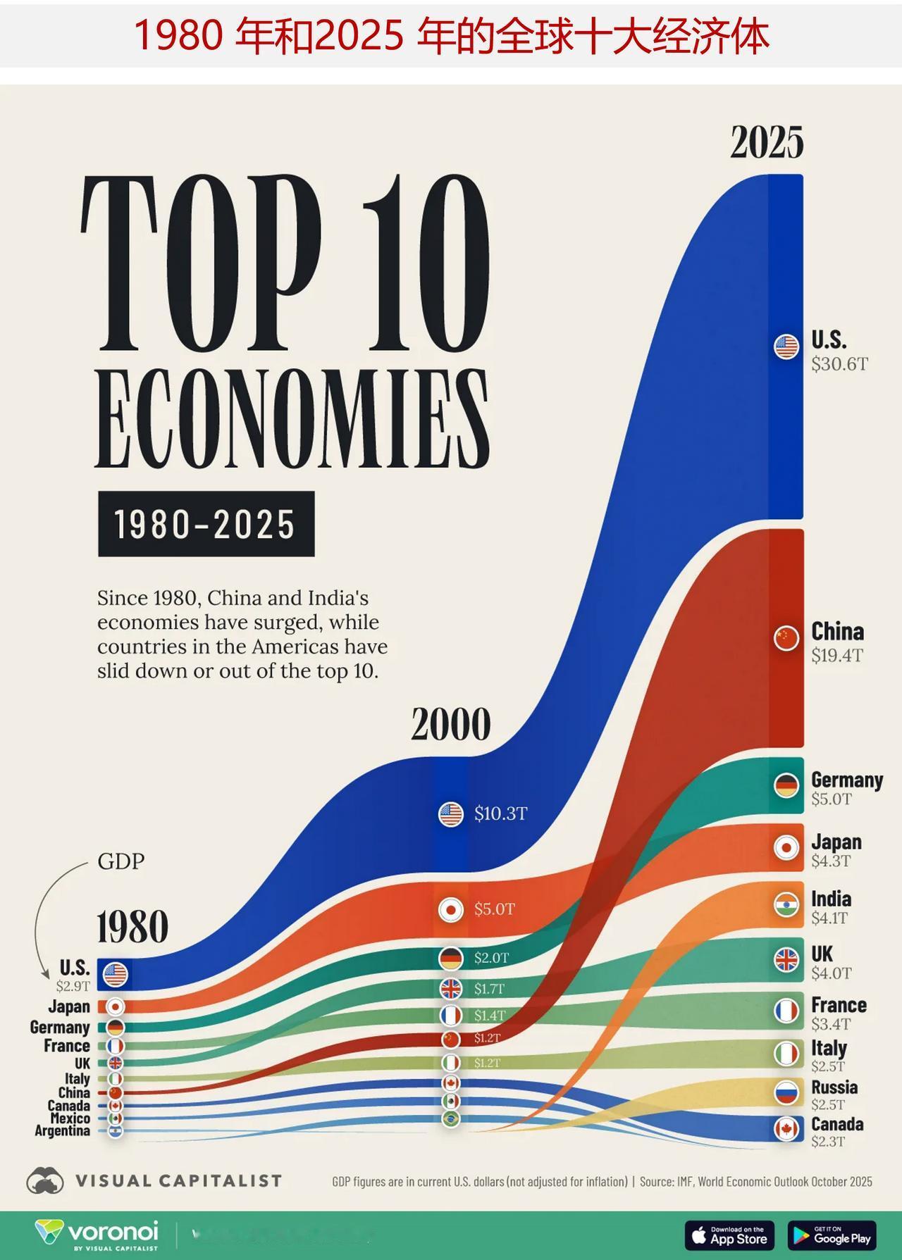 在过去四十年间,全球经济格局发生了什么变化? 一些经济体持续稳定增长,另一些则实现了大幅扩张,还有一些则因新势力的崛起而排名下滑。此图表展示了 1980 年至 2025 年期间全球主要经济体的情况。 此图表展示了 1980 年至 2025 年全球主要经济体的情况。该图表数据来自国际货币基金组织的《世界经济展望》(2025 年 10 月版)。这些数据以当前美元计价,并未根据通货膨胀进行调整。 ——美国一直稳居首位 自 1980 年以来,美国一直稳居全球最大的经济体之列。其国内生产总值从 1980 年的约 2.9 万亿美元增长至 2025 年的超过 30.6 万亿美元。尽管其在全球的占比有所波动,但美国凭借庞大的国内市场、发达的资本市场以及持续的生产力增长,一直保持着领先地位。 在过去的 45 年里,中国是全球经济中所经历的最显著的结构性变革的代表。 1980 年,中国的国内生产总值(GDP)还不到 3000 亿美元,排在世界前五名之外。而到 2010 年,中国已经超过了德国和日本;到 2025 年,中国稳居世界第二大经济体之位,其 GDP 已接近 19.4 万亿美元。 在 20 世纪 80 年代末和 90 年代初,日本在全球经济中占据主导地位,曾一度缩小与美国之间的差距。然而,经济增长放缓以及人口方面的不利因素导致其地位下降,到 2025 年已降至第四位。 欧洲最大的几个经济体——德国、英国和法国——一直位列前十之列。 ——新兴市场地位提升 除了中国之外,一些新兴经济体也跻身前列。印度的国内生产总值从 1980 年的不足 2000 亿美元增长至2025 年的超过 4.1 万亿美元,使其成为世界前五大经济体之一。 在排名前十之外的国家中,如巴西、墨西哥、印度尼西亚和土耳其等,其排名也有所上升,这反映出这些国家的长期增长速度超过了许多发达经济体。