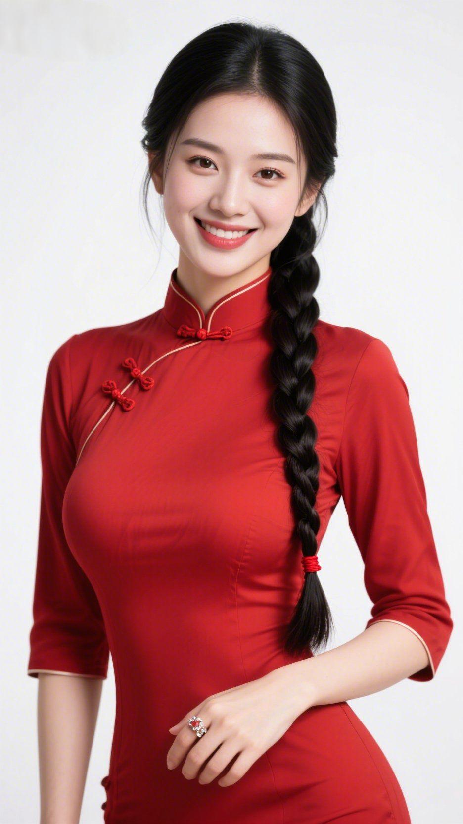 红旗袍韵藏芳华 素白背景前,她身着正红旗袍,朱红盘扣与衣料的艳色相映,麻花长辫垂在肩头,唇角的笑意清甜又温婉,似将中式美学的雅致与灵动揉进了这抹红里。旗袍的立领衬得眉目清隽,盘扣的细节藏着东方的婉约,这抹热烈的红,不是张扬的夺目,而是沉淀了东方韵味的温柔。 我们总在潮流里追逐新鲜,却忘了传统服饰里藏着的东方风骨。一件红旗袍,是对中式美学的致敬,也是对东方韵味的诠释。它不像现代服饰那般随性,却用最细腻的剪裁,诉说着东方女性的温婉与灵动。 传统与美从不是割裂的,一袭红旗袍,便能让东方的雅致在当下绽放。笑意漾在眉眼间,红袍衬出的温婉气质,原来中式美学的美好,就藏在这些细腻的传承里。 中式旗袍之美 东方韵味传承
