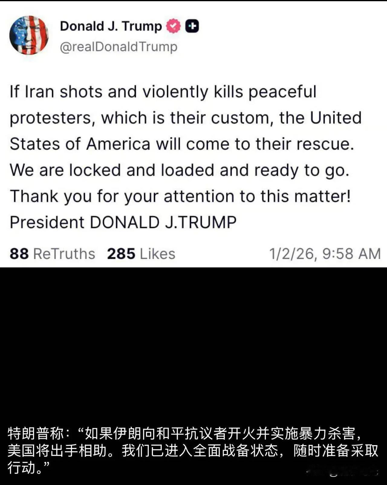 特朗普发出威胁:如果伊朗开枪并残暴地杀害和平抗议者(这是他们的惯常做法),美利坚合众国将前来救援。我们已严阵以待,准备行动。感谢大家对这一事件的关注!唐纳德·J·特朗普总统88次转发285个赞2026年1月2日 伊朗流亡王储礼萨 •巴列维icon在埃及icon街头受到民众欢呼,支持者们希望他有朝一日能够返回伊朗,重登王位。 一名年轻的伊朗基督徒请求内塔尼亚胡为伊朗居民提供紧急帮助,“我带着希望和信任为你录制了这段视频,你曾向我们承诺,如果我们走上街头,你会支持我们,现在我希望你兑现你的承诺,我们的人民正在被谋杀,请与我们站在一起,我感谢你们的善意和关注。”