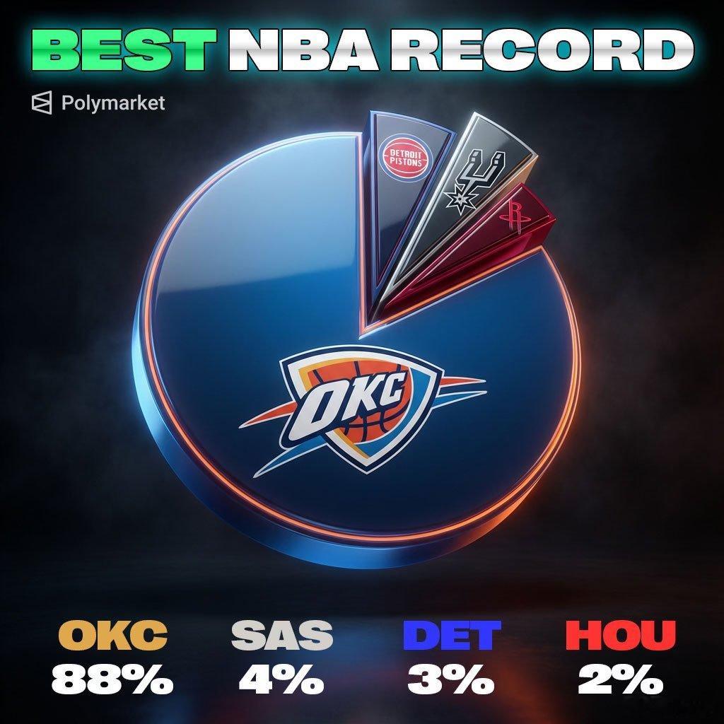 Polymarket的数据模型预测,雷霆队有88%的概率成为NBA常规赛战绩最佳的球队。马刺雷霆火箭分别有4%3%2%的几率而活塞马刺火箭目前仅分别落后4个、4.5个、6.5个胜场,而常规赛还剩下48场比赛。同意这个预测吗?休斯顿火箭