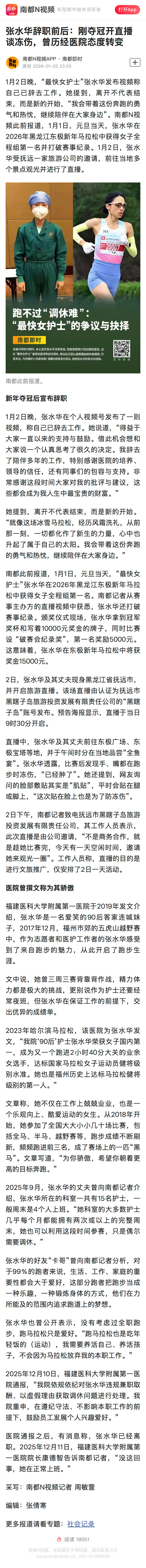 #医院曾撰文称为张水华骄傲#【#张水华辞职前后#:刚夺冠开直播谈冻伤,曾历经医院态度转变】#医院曾称希望张水华朝更高目标奔跑#1月2日晚,“最快女护士”张水华发布视频称自己已辞去工作。她提到,离开不代表结束,而是新的开始,“我会带着这份奔跑的勇气和热忱,继续陪伴在大家身边”。南都N视频此前报道,1月1日,元旦当天,张水华在2026年黑龙江东极新年马拉松中获得女子全程组第一名并打破赛事纪录。1月2日,张水华受抚远一家旅游公司的邀请,前往当地多个景点观光并进行了直播。福建医科大学附属第一医院于2019年发文介绍,张水华是一名爱笑的90后客家连城妹子,2017年12月,福州市郊的五虎山越野赛中,作为志愿者和医护工作者的张水华感受到了来自跑步的魅力,从此开启了跑步生涯。文中说,她曾三周三赛背靠背作战,精力体力都是极大的挑战,更别说作为护士还要经常夜班,但张水华在保证工作的前提下,交出优异的成绩单。 2023年哈尔滨马拉松,该医院为张水华发文,“我院‘90后’护士张水华荣获女子国内第一,成为又一个跑进2小时40分大关的业余女选手,达标国家马拉松女子运动员健将级别水准。她也是福州历史上达标马拉松健将级别的第一人。” 文章称,她不仅在工作上兢兢业业,也是一个乐观向上、酷爱运动的女生。从2018年开始,她参加了全国大大小小几十场比赛,包括全马、半马、越野赛等,跑步成绩不断刷新,频频跑进前三名,成了赛场上的一匹“黑马”。文章写道,“为你骄傲,希望你朝着更高的目标奔跑。” 南都N视频记者 周敏萱张水华辞职前后:刚夺冠开直播谈冻伤,曾历经医院态度转变