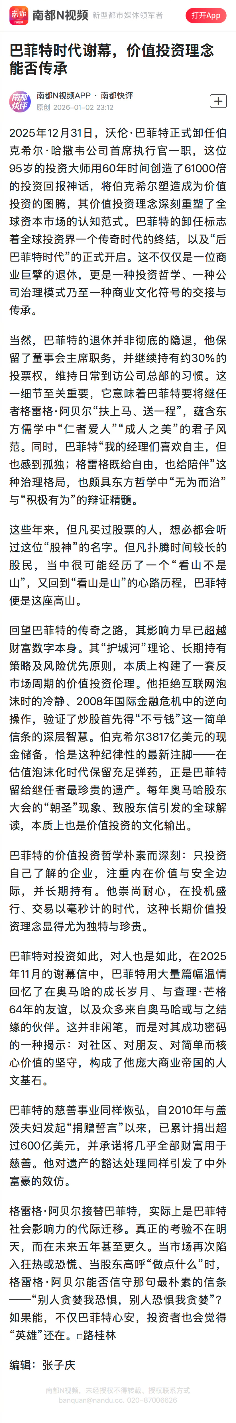 #后巴菲特时代价值投资何去何从#【南都快评:巴菲特时代谢幕,价值投资理念能否传承】2025年12月31日,沃伦·巴菲特正式卸任伯克希尔·哈撒韦公司首席执行官一职,这位95岁的投资大师用60年时间创造了61000倍的投资回报神话,将伯克希尔塑造成为价值投资的图腾,其价值投资理念深刻重塑了全球资本市场的认知范式。巴菲特的卸任标志着全球投资界一个传奇时代的终结,以及“后巴菲特时代”的正式开启。这不仅仅是一位商业巨擘的退休,更是一种投资哲学、一种公司治理模式乃至一种商业文化符号的交接与传承。回望巴菲特的传奇之路,其影响力早已超越财富数字本身。其“护城河”理论、长期持有策略及风险优先原则,本质上构建了一套反市场周期的价值投资伦理。他拒绝互联网泡沫时的冷静、2008年国际金融危机中的逆向操作,验证了炒股首先得“不亏钱”这一简单信条的深层智慧。伯克希尔3817亿美元的现金储备,恰是这种纪律性的最新注脚——在估值泡沫化时代保留充足弹药,正是巴菲特留给继任者最珍贵的遗产。每年奥马哈股东大会的“朝圣”现象、致股东信引发的全球解读,本质上也是价值投资的文化输出。格雷格·阿贝尔接替巴菲特,实际上是巴菲特社会影响力的代际迁移。真正的考验不在明天,而在未来五年甚至更久。当市场再次陷入狂热或恐慌、当股东高呼“做点什么”时,格雷格·阿贝尔能否信守那句最朴素的信条——“别人贪婪我恐惧,别人恐惧我贪婪”?如果能,不仅巴菲特心安,投资者也会觉得“英雄”还在。巴菲特时代谢幕,价值投资理念能否传承