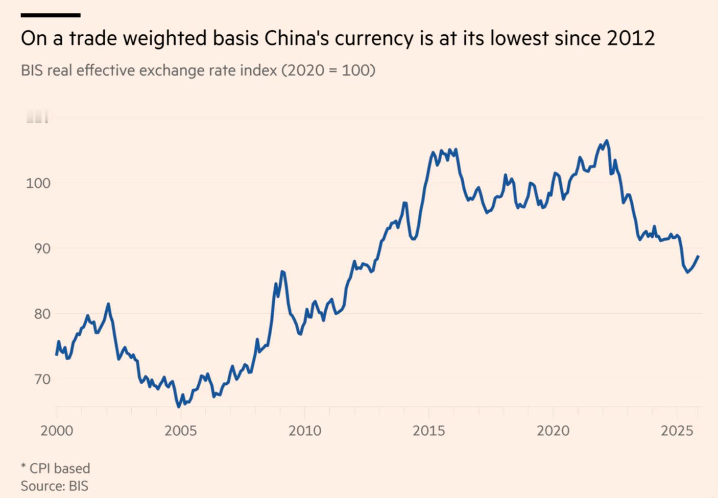 人民币贬值掩盖了中国出口数量的激增金融时报文章,贸易加权评估的人民币指数,目前人民币实际是2012年以来的最低值。2025年人民币对欧元就贬值了8%,相较2022年3月的峰值低了18%。中国出口数量的激增,比人们从出口数值上看到的还多,但被贬值掩盖了,只表现出温和的上升。中国占全球出口市场份额从2017年的约13%上升至15%,并不是太多,到2030年按摩根斯坦利估计的16.5%,似乎只是温和增加。中国在全球制造业增加值中的份额升至28%,不如一些领域中国产量占全球50%以上那么吓人。以量计算,2020年初以来,中国的商品出口量增长了43%,但商品进口量仅增长了15%。文章主要是说欧洲吃亏了,中国用人民贬值来促进出口。大段内部是关于中国经济前景不佳的描述,现在国际流行叙事改成了“经济差,所以要出口来撑经济”。开始是说出口顺差超1万亿美元,中国强大无法阻挡。但现在改了,顺差越大说明经济越差。总体是震荡的,先震惊下,再平复下情绪继续黑,过阵子又震惊。