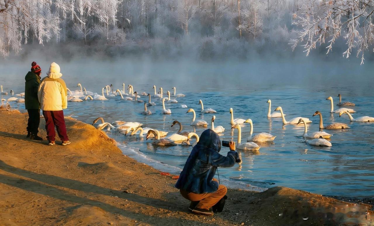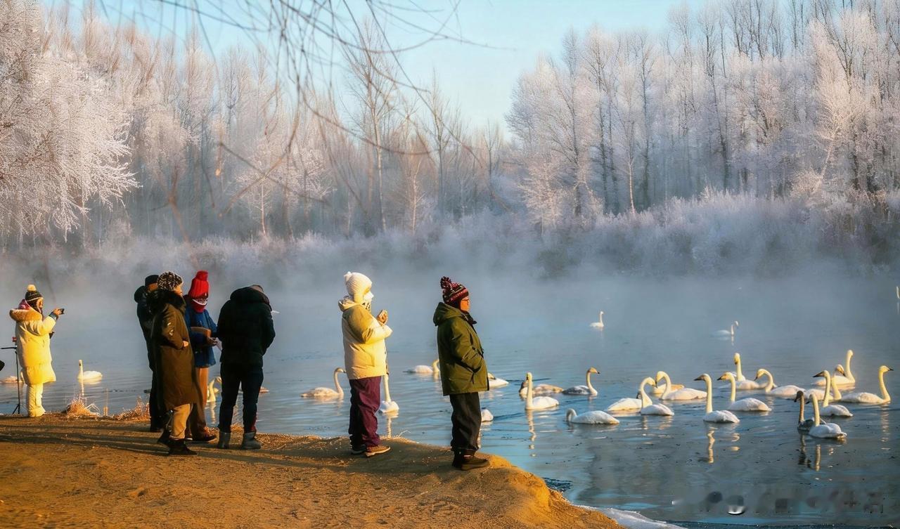 2026年新年次日,我于辽宁北票张吉营子捕捉到绝美瞬间——白天鹅与雾凇浪漫邂逅。北票地处东亚 - 澳大利亚候鸟迁徙通道,是重要的停歇站点,白石水库周边湿地则是天鹅的主要落脚点。 2016年,仅有6只天鹅飞来,其中4只留下越冬,而如今数量已达400余只。这里是中国仅有的两处能同时观赏白天鹅与雾凇的地方之一。天鹅在晨雾中悠然游弋,与雾凇完美融合,宛如梦幻的童话世界。此地距离北京仅两小时高铁车程,若没去成新疆伊犁天鹅湖,来这儿准没错!