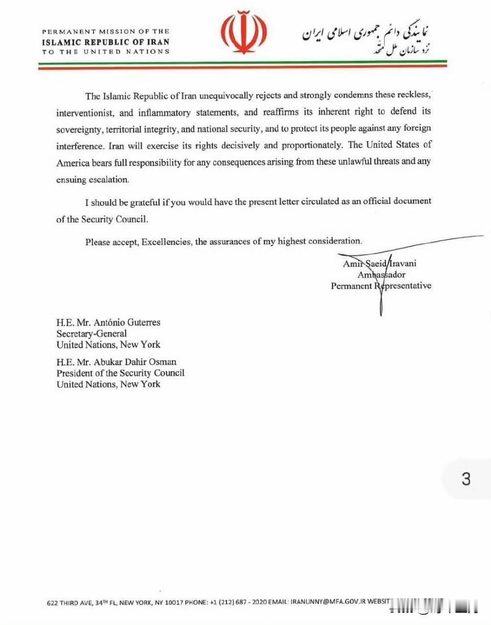 伊朗向联合国秘书长安东尼奥·古特雷斯及联合国安理会成员发出信函,抗议特朗普总统在Truth Social平台上发布的关于伊朗示威活动的帖子。 信函强调,若美国试图干预,伊朗将“果断且适度行使自卫权”。 此前,特朗普警告伊朗,如果伊朗向和平抗议者开枪,或暴力杀害他们,美国将采取行动。