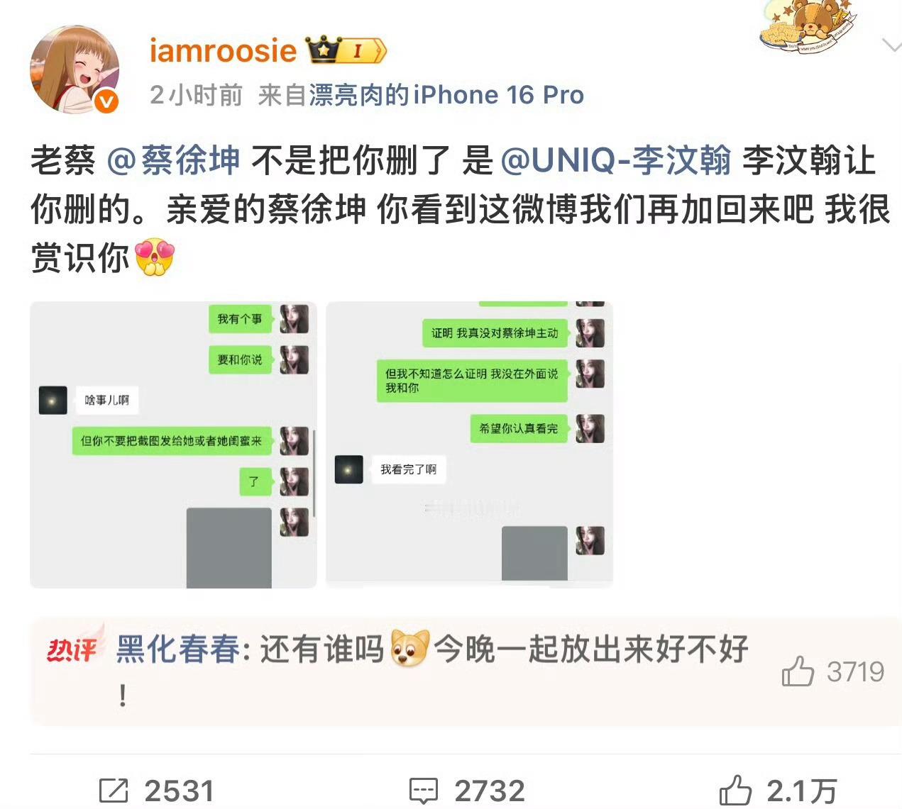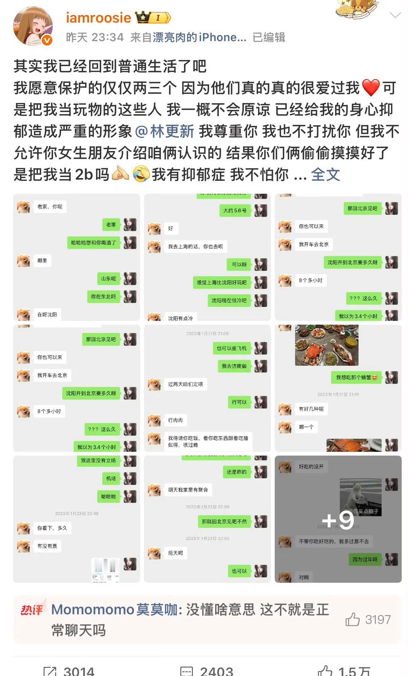 所有顶流都睡完了 一觉醒来发现内娱天塌了,网友"iamroosie"(本名司晓迪)连发多条爆料,直接点名林更新、范丞丞、蔡徐坤、李汶翰、鹿晗、檀健次等十余名男艺人,还发了"所有顶流都睡完了"的爆炸性言论!目前鹿晗、范丞丞已澄清,称爆料为女方遐想、个人臆测,网友辣评2026是司晓迪元年其他明星的工作室别睡了,赶紧起来干活儿呀!