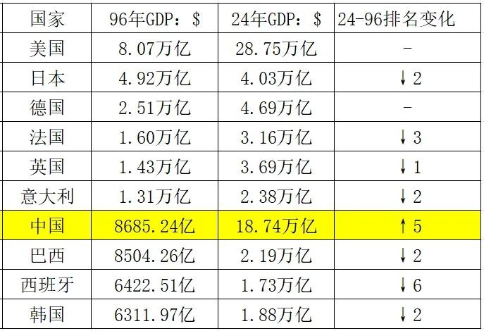 1996年中国的GDP和巴西一个级别,才8700亿美元,30年后,GDP达到了18.74万亿美元。 当年GDP前10的国家,只有中美在迅速发展,其他国家都发展缓慢,甚至个别国家在倒退,当然美国有他的特殊性,因为美元是世界货币,他可以收割全世界的财富,中国不一样,可以这么说,这30年来真正迅速发展的只有中国。 日本96年GDP4.92万亿,2024年竟然缩水到了只有4万亿美元,我们要知道,三十年前的美元是什么购买力啊,可见日本的经济缩水有多严重。 德国、法国、英国、西班牙、意大利、巴西、韩国虽然排名都在下降,但现在的GDP总量是1996年那时候的2-3倍,就只有小日子在反向发展。