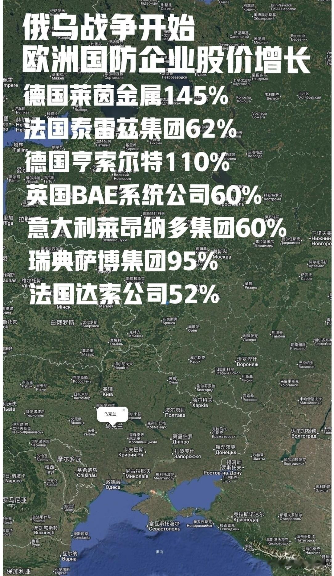 乌克兰用25万人的生命换来了欧洲军火公司的疯涨 从欧盟公布的欧洲各军工企业的增长情况来看,自俄乌战争开始: 德国莱茵金属股价增长了145%,国防板块增长了47%。 法国泰雷兹集团增长62% 德国亨索尔特公司增长了110% 英国BAE系统公司增长了60% 意大利莱昂纳多集团增长了60% 瑞典萨博集团增长了95% 法国达索公司增长可52% 俄乌战争开始,欧盟向乌克兰提供武器和装备,本来已经岌岌可危的欧盟国防工业突然就迎来了“第二春”,各公司的股价开始迅速增长,而这一切都是在乌克兰付出了25万人生命的代价(华尔街日报数据)。 然而在特朗普第一次提出和平协议时欧洲各军工企业的股价就相应下降,泽连斯基袭击俄罗斯石化产业之后各企业的股票又开始上涨。