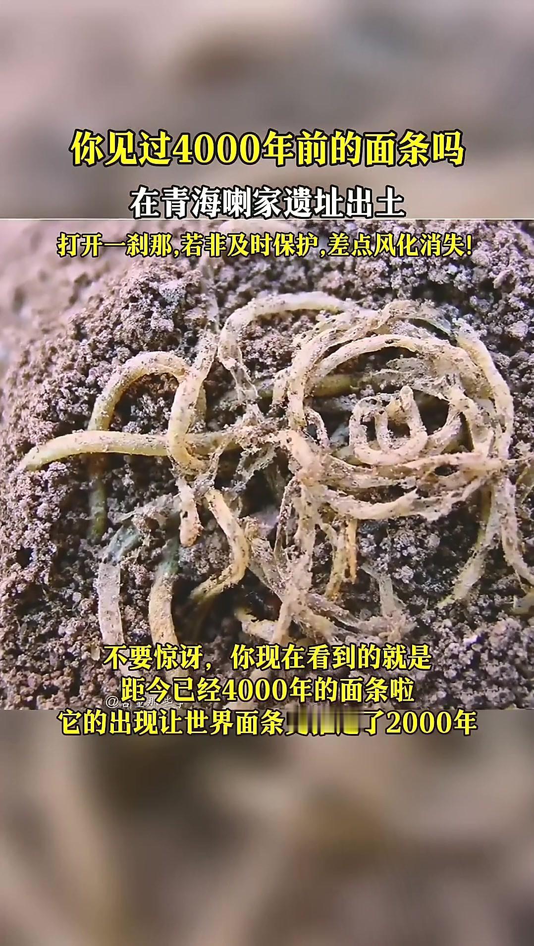 距今4000多年,一碗古老的面条在中国青海被发现,它究竟是怎样的模样? 在2002年的考古发掘中,位于青海省海东市的喇家遗址意外地揭示了一个令人震惊的秘密——4000多年前的一碗面条。2002年11月22日,在喇家遗址的一间房屋内,考古学家蔡林海发现了一个双耳陶罐下方斜压着一只倒扣的陶碗,揭开陶碗的一瞬间,他惊喜地发现碗底有一团粗细均匀、长约50厘米的黄色条状物,经北京实验室分析,这些条状物主要由小米和黄米制成,并含有油脂和维生素成分。这一发现不仅将中国面条的历史向前推进了数千年,还终结了“面条源于西方”的争议,证明中国是面条的发源地之一。 中华先民 先民故事 混沌面条