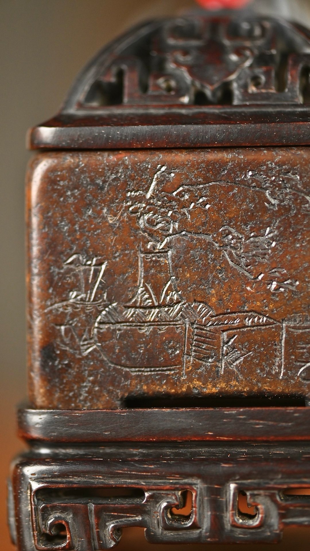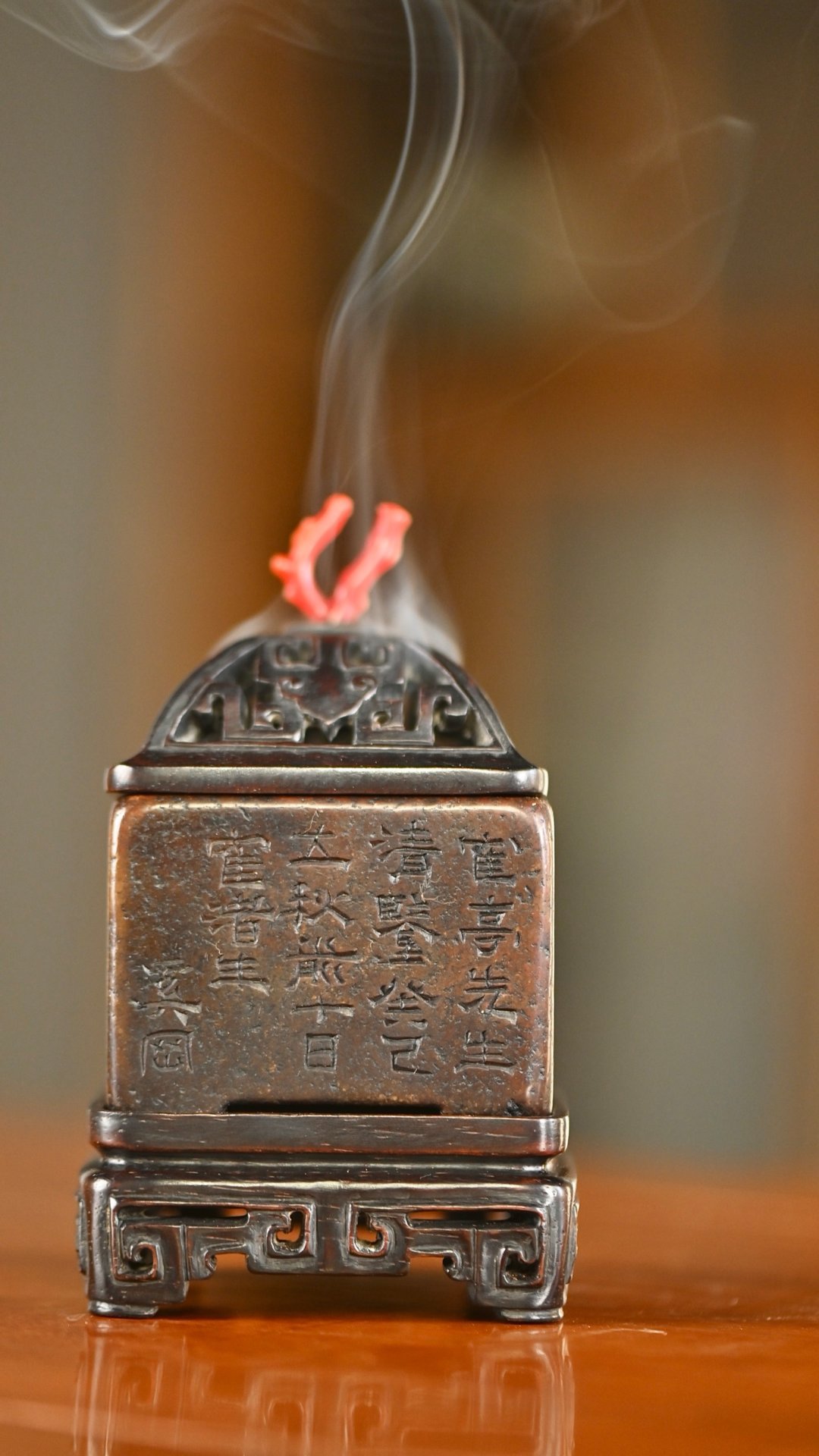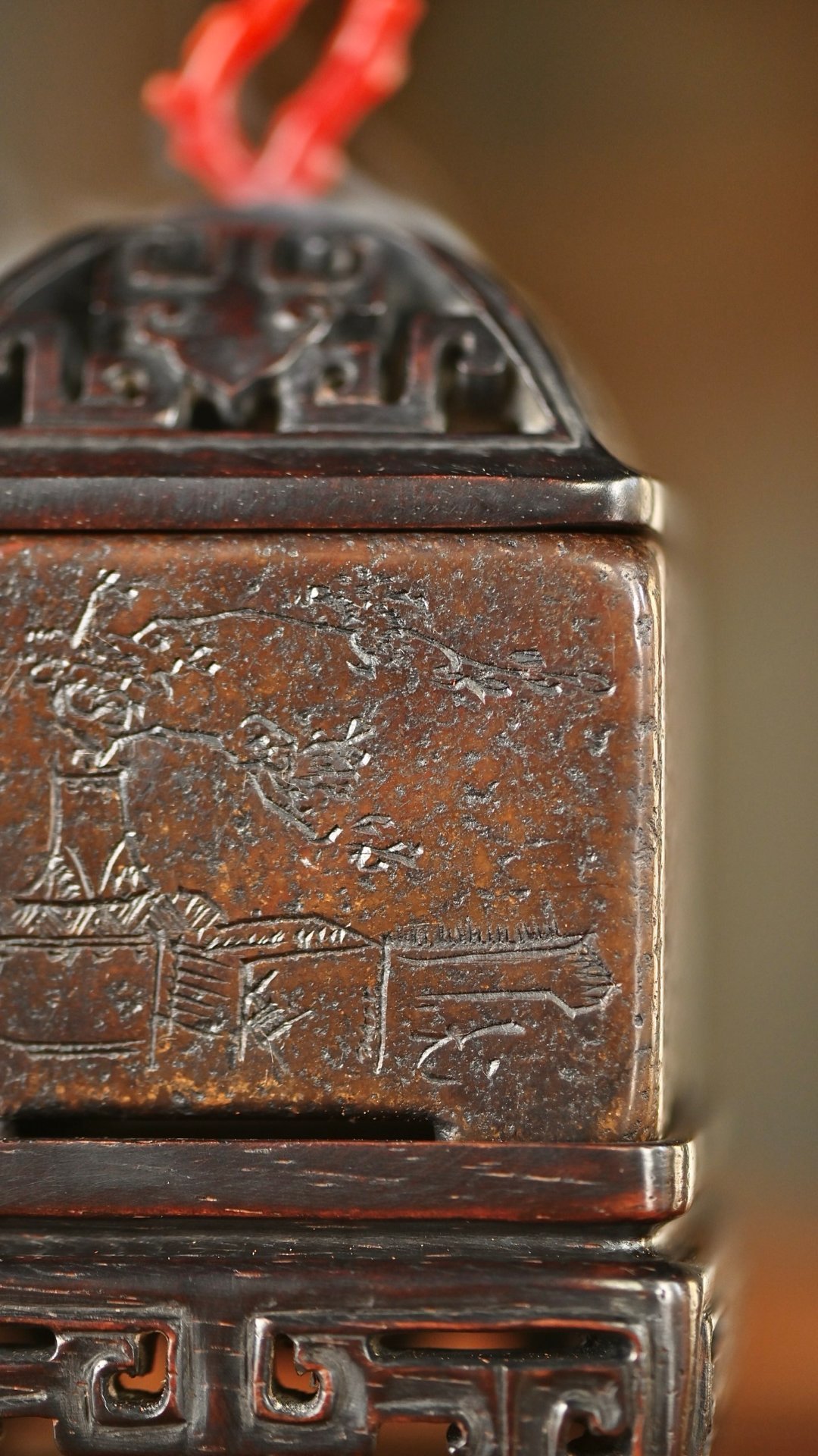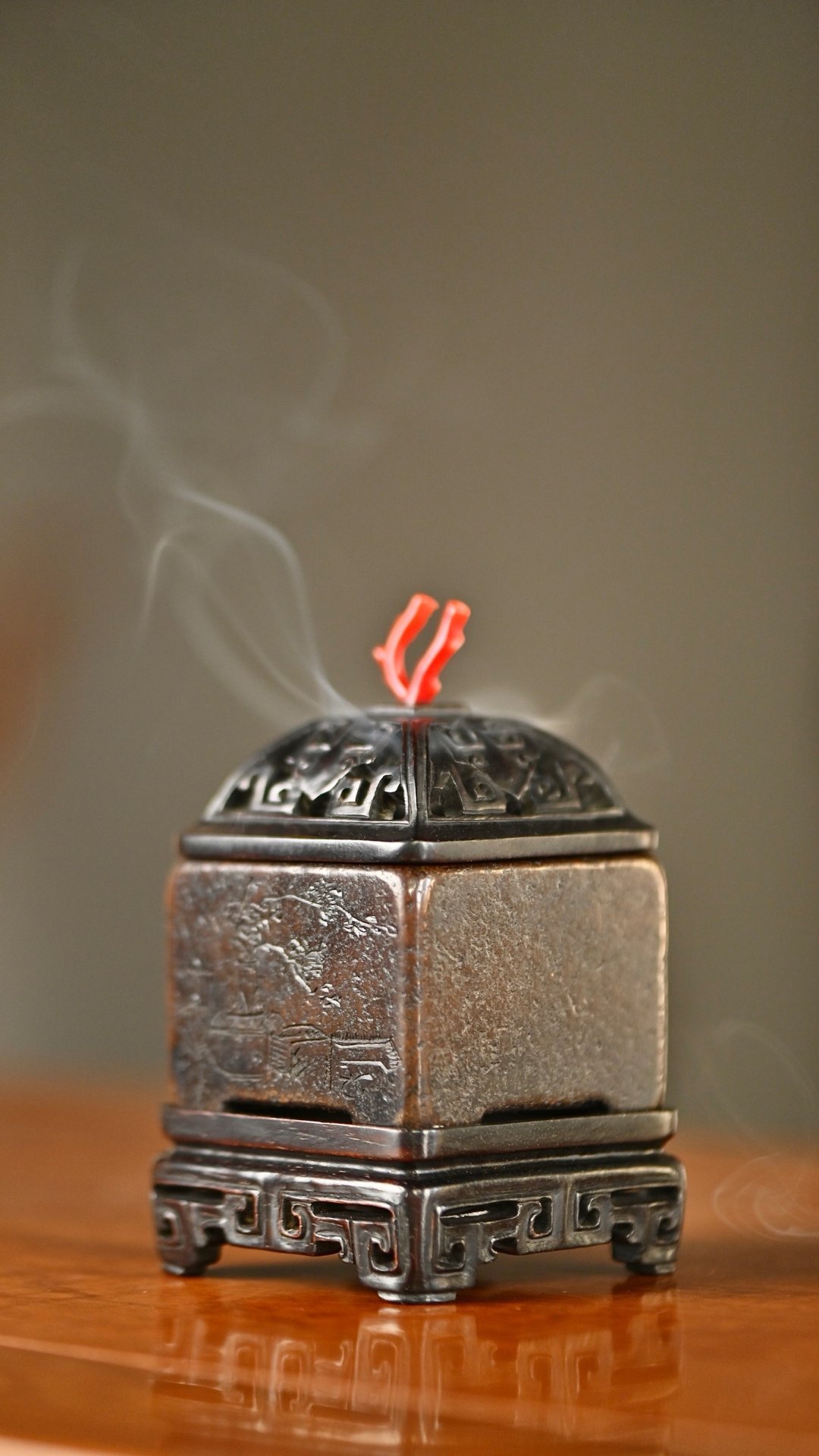 寿山石 | 香炉寿山石香炉,造型端庄,包浆温润,它将雕刻、诗文、香道文化融为一体,是实用与美学的完美结合。炉盖的设计精巧,既利于香烟回旋,又为整体增添了层次感。6.9×6.8×11.5cm