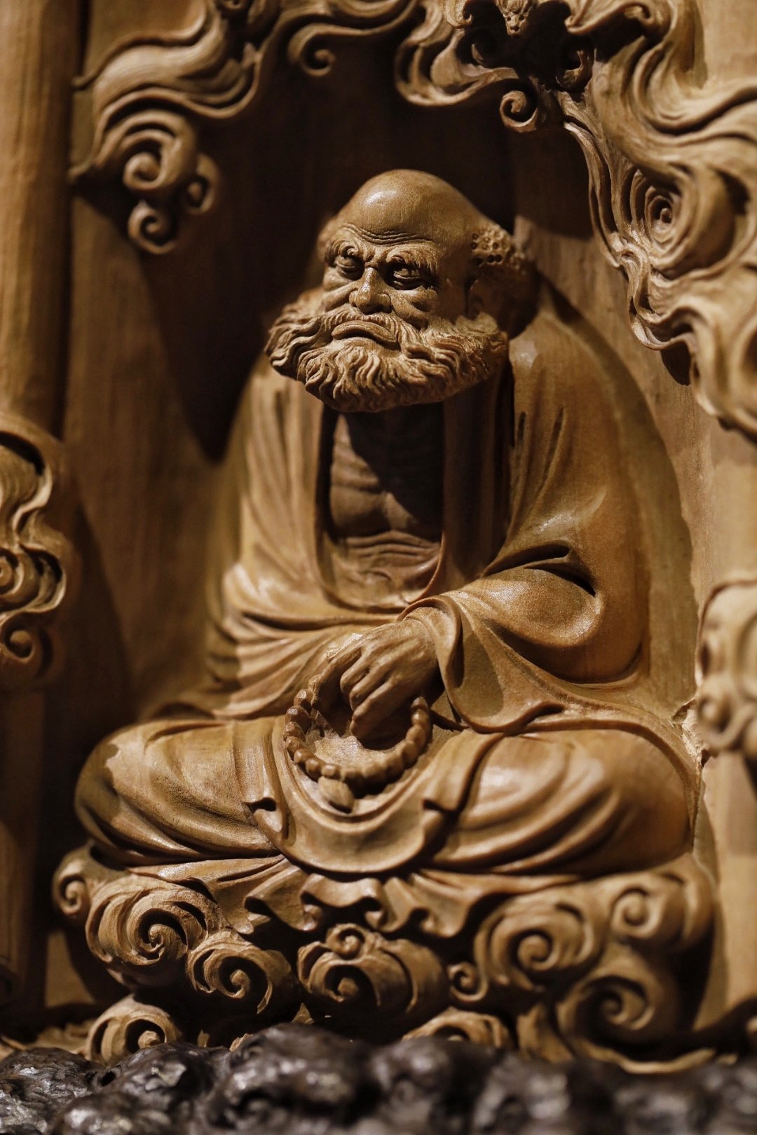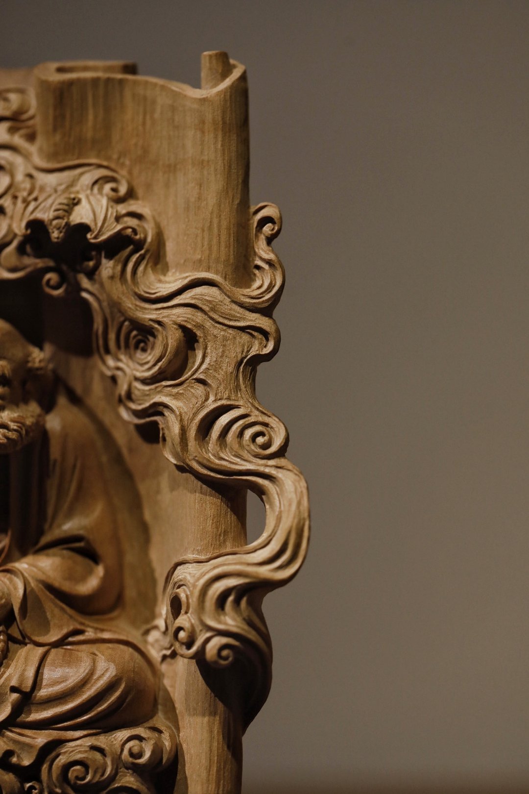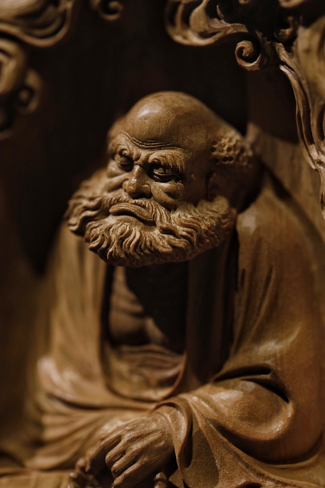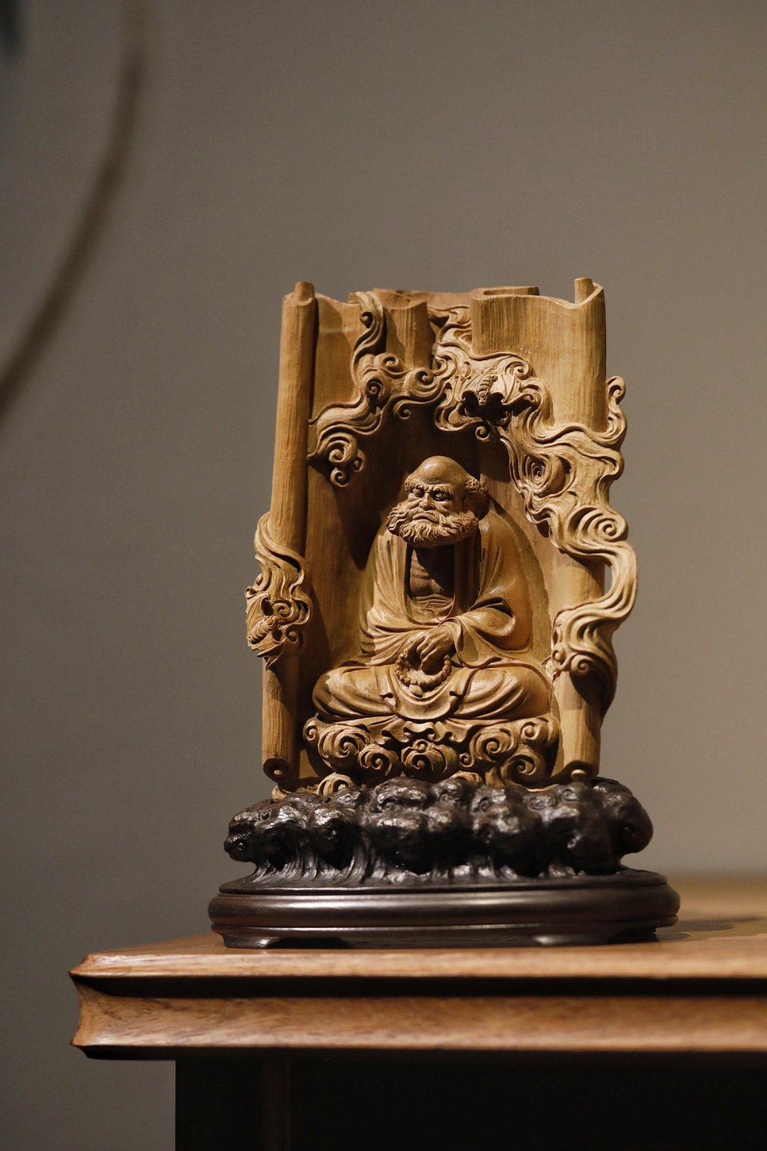 老山檀香 | 达摩 摆件整料清刀制像,达摩端坐于云纹之间,面容苍劲,须髯虬结,神态肃穆而沉静。周身云纹卷曲流转,层层叠叠如浪似烟,将达摩禅定之姿衬得愈发庄严。刀法刚劲却不失婉转,凝刻出禅意悠悠,古拙之气扑面而来。规格:12×5×16cm重量226g底座:14×8×5cm整体高度20cm