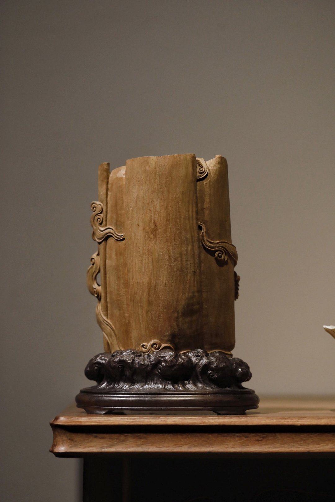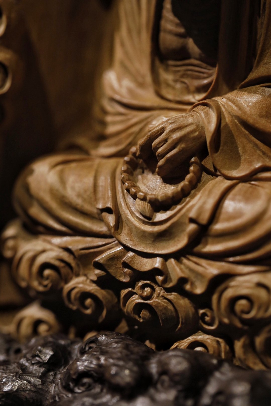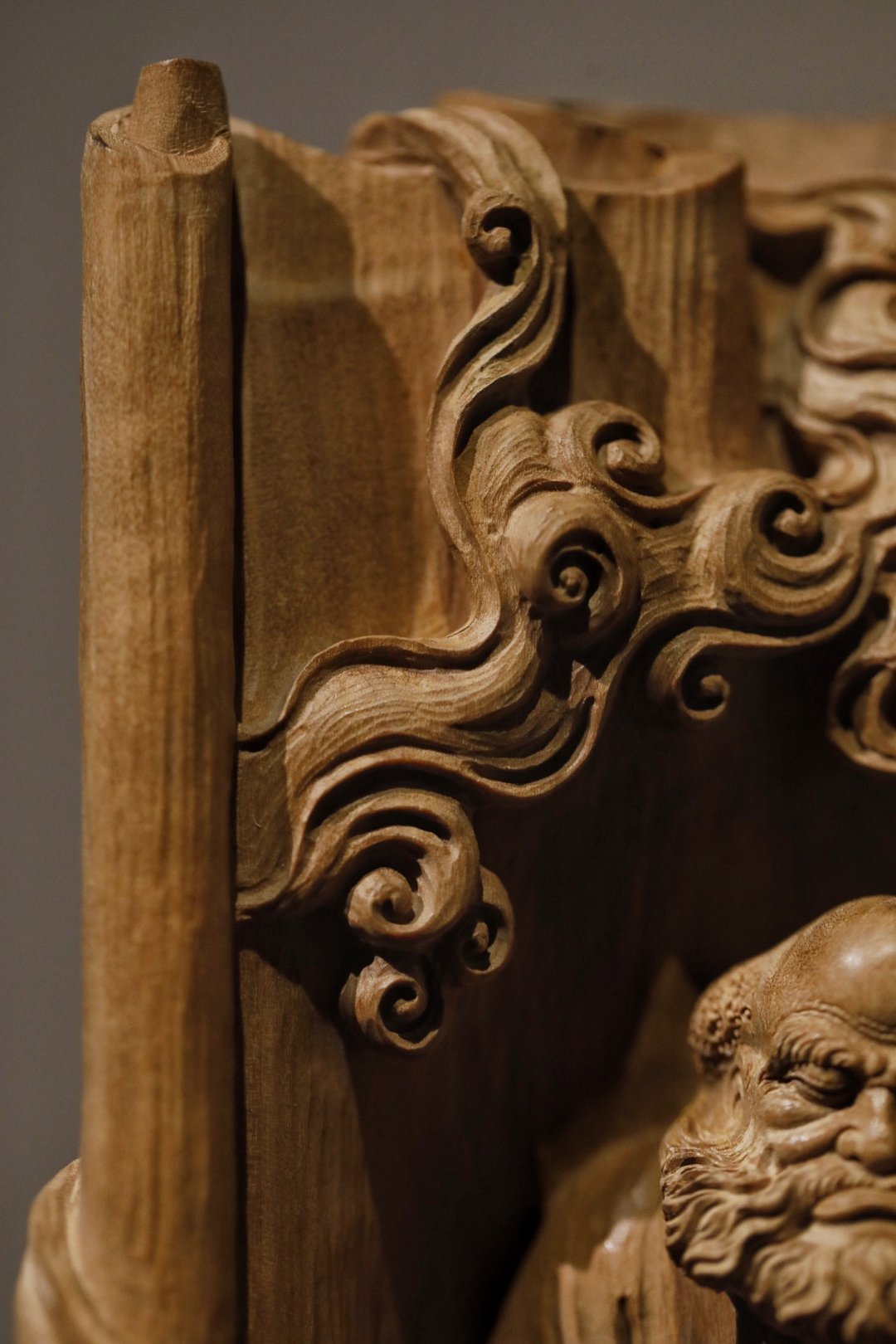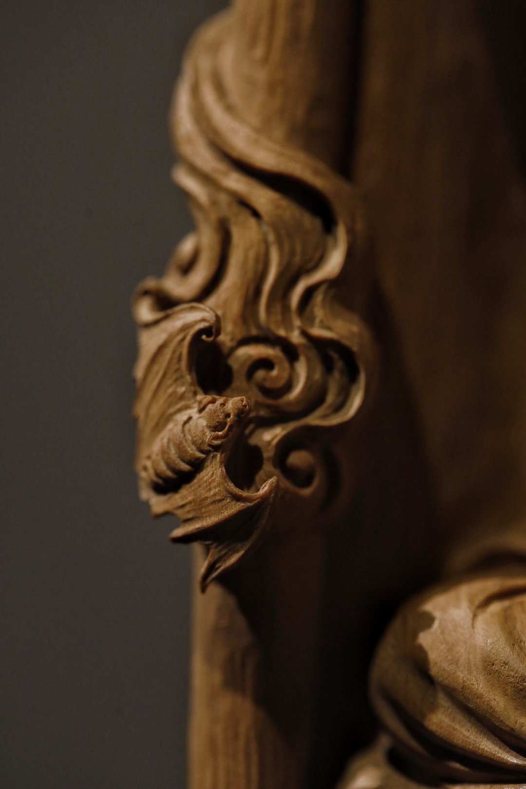 老山檀香 | 达摩 摆件整料清刀制像,达摩端坐于云纹之间,面容苍劲,须髯虬结,神态肃穆而沉静。周身云纹卷曲流转,层层叠叠如浪似烟,将达摩禅定之姿衬得愈发庄严。刀法刚劲却不失婉转,凝刻出禅意悠悠,古拙之气扑面而来。规格:12×5×16cm重量226g底座:14×8×5cm整体高度20cm