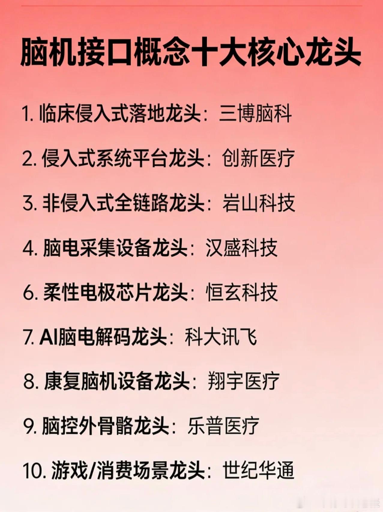 脑机接口概念十大核心龙头1.临床侵入式落地龙头:三博脑科2.侵入式系统平台龙头:创新医疗3.非侵入式全链路龙头:岩山科技4.脑电采集设备龙头:汉盛科技6.柔性电极芯片龙头:恒玄科技7.AI脑电解码龙头:科大讯飞8.康复脑机设备龙头:翔宇医疗9.脑控外骨骼龙头:乐普医疗10.游戏/消费场景龙头:世纪华通