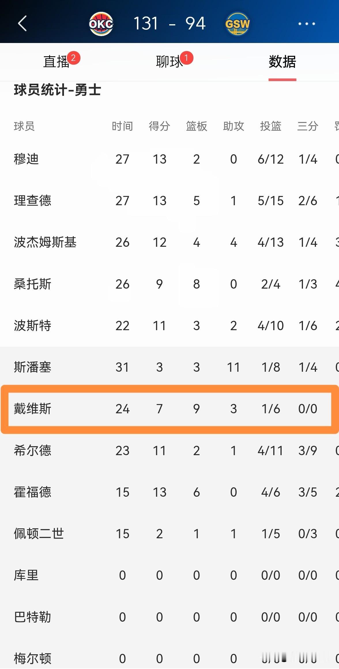 勇士中锋TJD的终结效率真是太低了!在今天勇士主场以94:131惨败于雷霆的比赛中,TJD替补出战24分钟,投篮6中1,其中罚球6中5得到7分9篮板3助攻1抢断1盖帽,他的场上正负值为-22。 作为一名中锋,TJD必须在接下来的比赛中提高自己的进攻效率,不然的话他很难得到主帅科尔的重用。