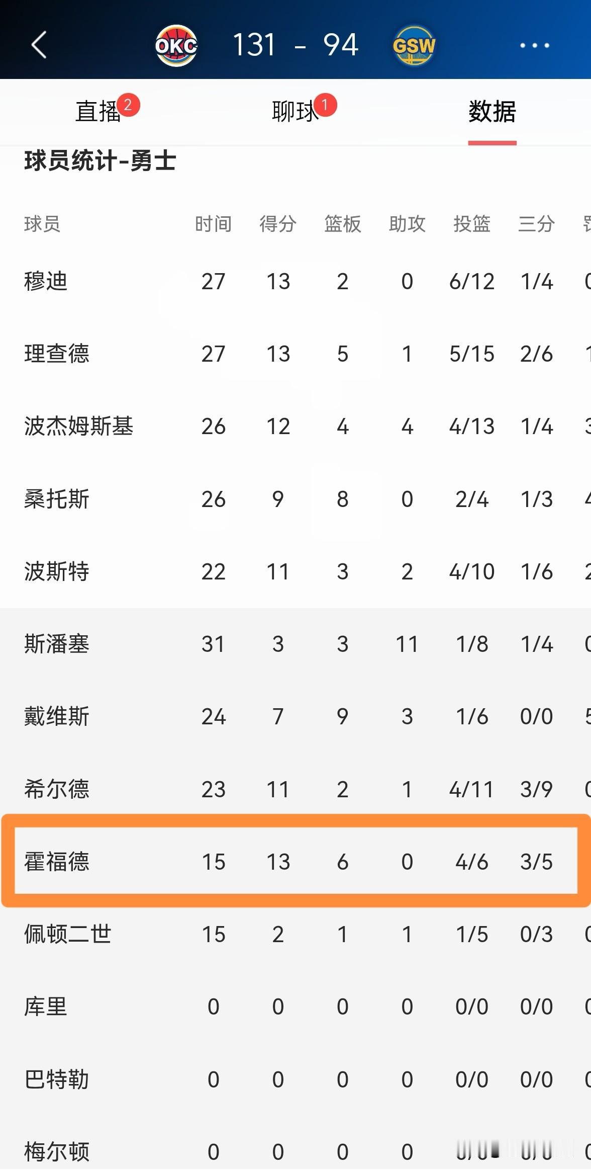 我一定要怒赞勇士老将霍福德!虽然今天勇士在主场以94:131惨败于雷霆,但是39岁的霍福德却表现亮眼,打出了让人非常惊喜的表现。 全场比赛下来,霍福德替补出战15分钟,投篮6中4,其中三分球5中3、罚球2中2非常高效的得到13分6篮板2盖帽。 事实证明,霍福德的油箱里不仅还有油,而且还有不少油。